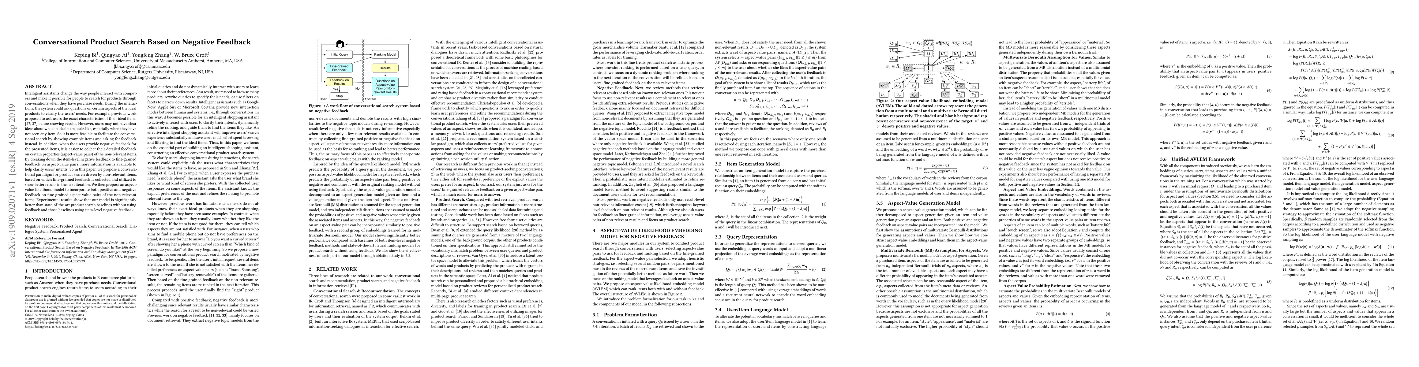 This paper proposes a conversational product search method that leverages negative feedback on non-relevant items to refine search results. It uses fine-grained feedback on aspect-value pairs to better understand user intents and introduces an aspect-value likelihood model to improve search accuracy, outperforming existing baselines.