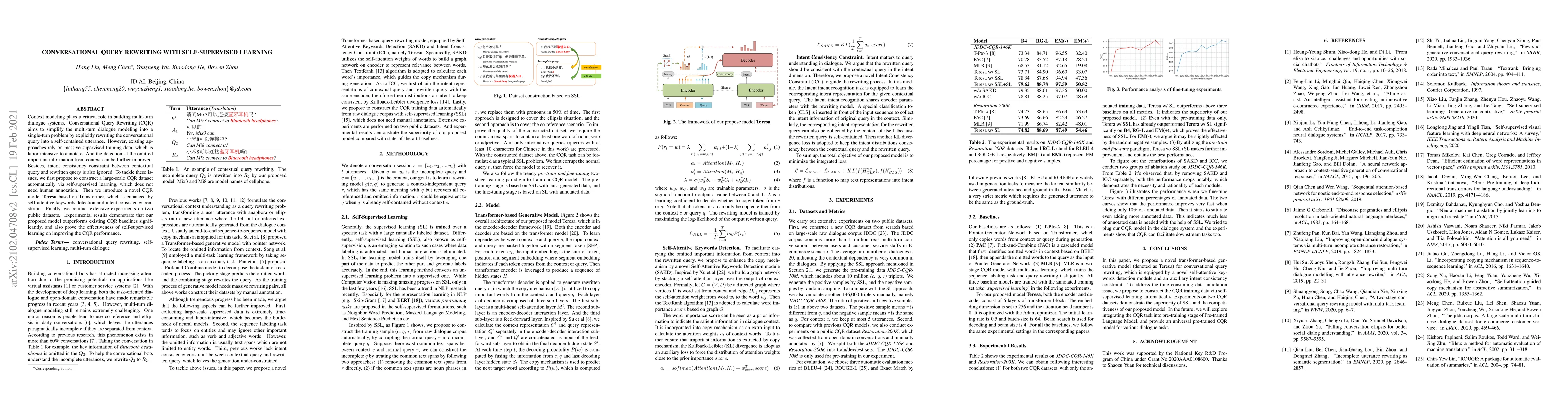 This paper proposes a self-supervised learning approach to construct a large-scale Conversational Query Rewriting (CQR) dataset without human annotation. It introduces a novel CQR model, Teresa, enhanced with self-attentive keywords detection and intent consistency, which outperforms existing methods on public datasets.