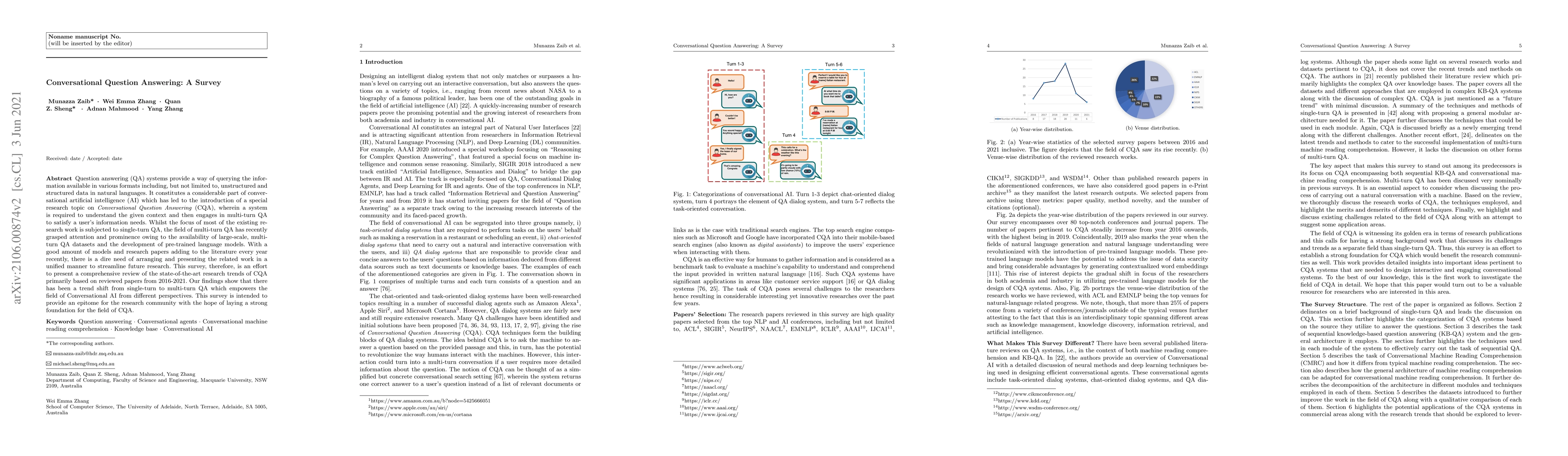 Question answering (QA) systems provide a way of querying the information available in various formats including, but not limited to, unstructured and structured data in natural languages. It constitutes a considerable part of conversational artificial intelligence (AI) which has led to the introduction of a special research topic on Conversational Question Answering (CQA), wherein a system is required to understand the given context and then engages in multi-turn QA to satisfy the user's information needs. Whilst the focus of most of the existing research work is subjected to single-turn QA, the field of multi-turn QA has recently grasped attention and prominence owing to the availability of large-scale, multi-turn QA datasets and the development of pre-trained language models. With a good amount of models and research papers adding to the literature every year recently, there is a dire need of arranging and presenting the related work in a unified manner to streamline future research. This survey, therefore, is an effort to present a comprehensive review of the state-of-the-art research trends of CQA primarily based on reviewed papers from 2016-2021. Our findings show that there has been a trend shift from single-turn to multi-turn QA which empowers the field of Conversational AI from different perspectives. This survey is intended to provide an epitome for the research community with the hope of laying a strong foundation for the field of CQA.