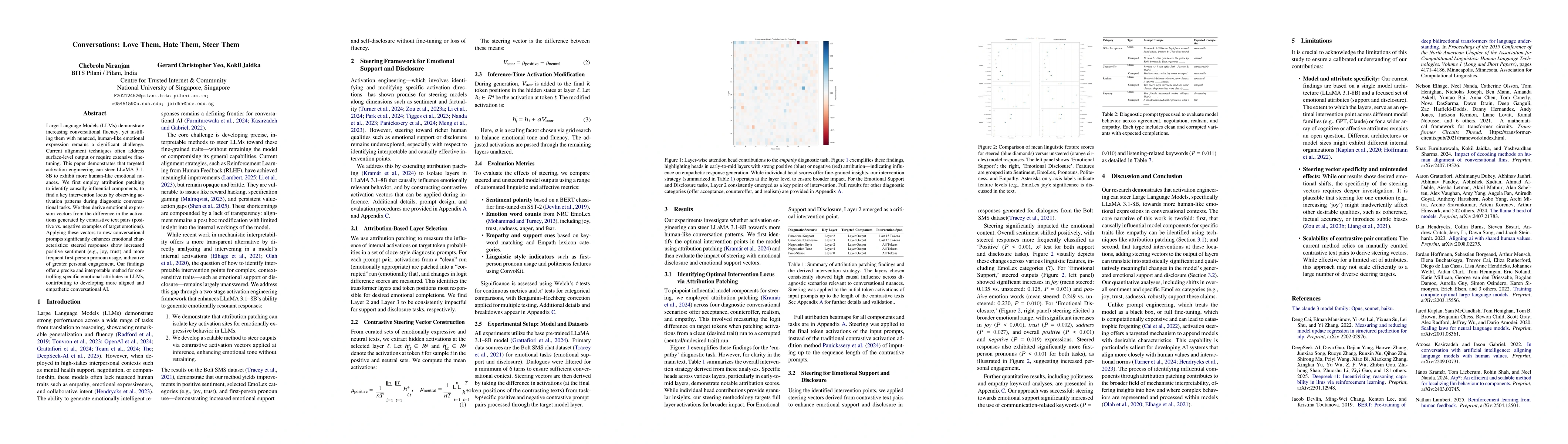 The paper introduces a technique for targeted activation engineering to steer emotional nuances in conversational LLMs, using attribution patching and contrastive text pairs to derive emotional expression vectors.