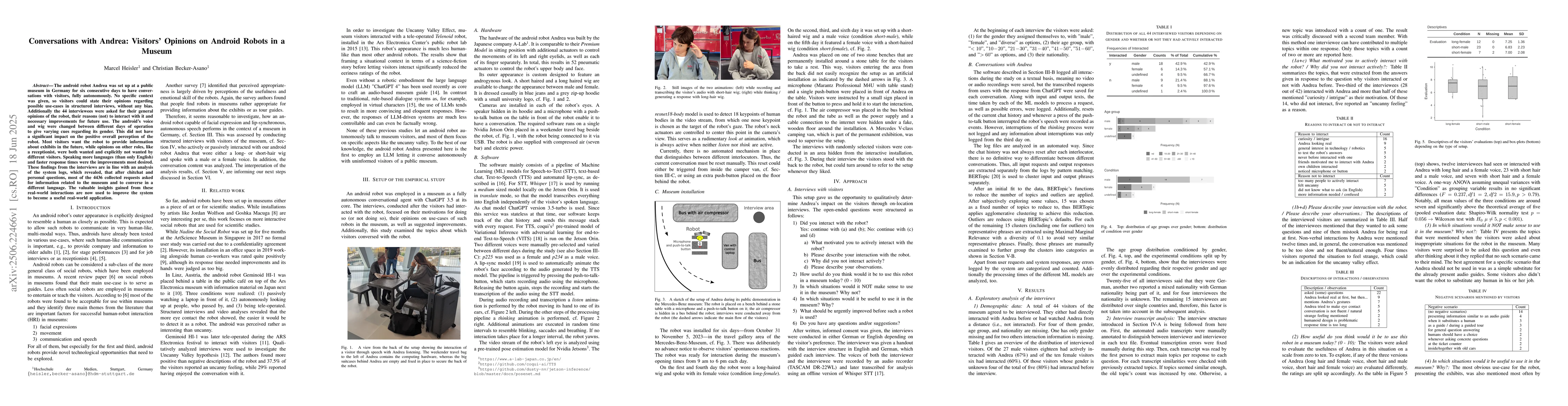 The android robot Andrea was set up at a public museum in Germany for six consecutive days to have conversations with visitors, fully autonomously. No specific context was given, so visitors could state their opinions regarding possible use-cases in structured interviews, without any bias. Additionally the 44 interviewees were asked for their general opinions of the robot, their reasons (not) to interact with it and necessary improvements for future use. The android's voice and wig were changed between different days of operation to give varying cues regarding its gender. This did not have a significant impact on the positive overall perception of the robot. Most visitors want the robot to provide information about exhibits in the future, while opinions on other roles, like a receptionist, were both wanted and explicitly not wanted by different visitors. Speaking more languages (than only English) and faster response times were the improvements most desired. These findings from the interviews are in line with an analysis of the system logs, which revealed, that after chitchat and personal questions, most of the 4436 collected requests asked for information related to the museum and to converse in a different language. The valuable insights gained from these real-world interactions are now used to improve the system to become a useful real-world application.