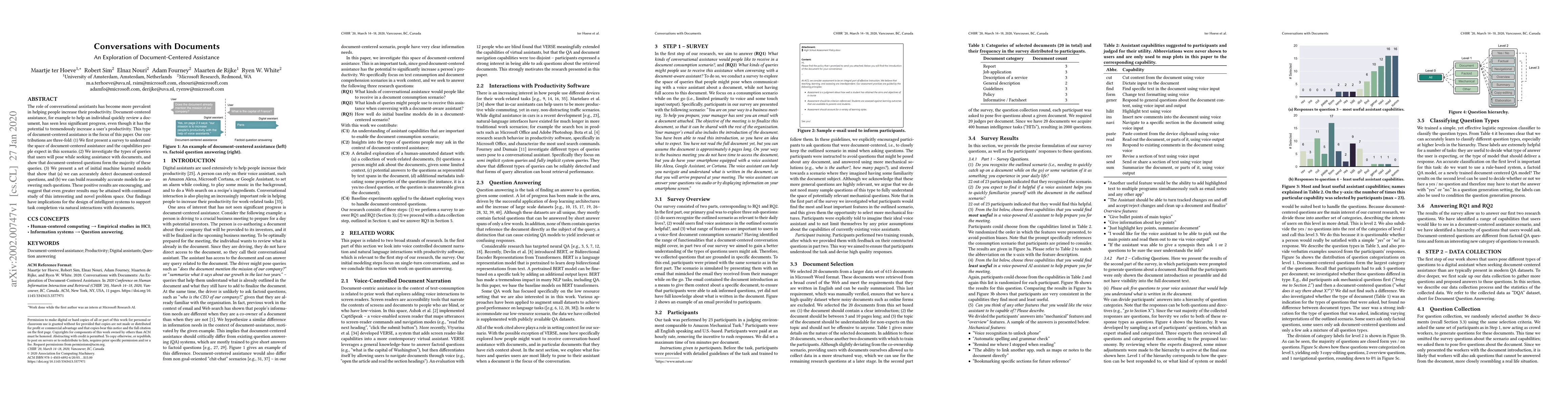 The role of conversational assistants has become more prevalent in helping people increase their productivity. Document-centered assistance, for example to help an individual quickly review a document, has seen less significant progress, even though it has the potential to tremendously increase a user's productivity. This type of document-centered assistance is the focus of this paper. Our contributions are three-fold: (1) We first present a survey to understand the space of document-centered assistance and the capabilities people expect in this scenario. (2) We investigate the types of queries that users will pose while seeking assistance with documents, and show that document-centered questions form the majority of these queries. (3) We present a set of initial machine learned models that show that (a) we can accurately detect document-centered questions, and (b) we can build reasonably accurate models for answering such questions. These positive results are encouraging, and suggest that even greater results may be attained with continued study of this interesting and novel problem space. Our findings have implications for the design of intelligent systems to support task completion via natural interactions with documents.