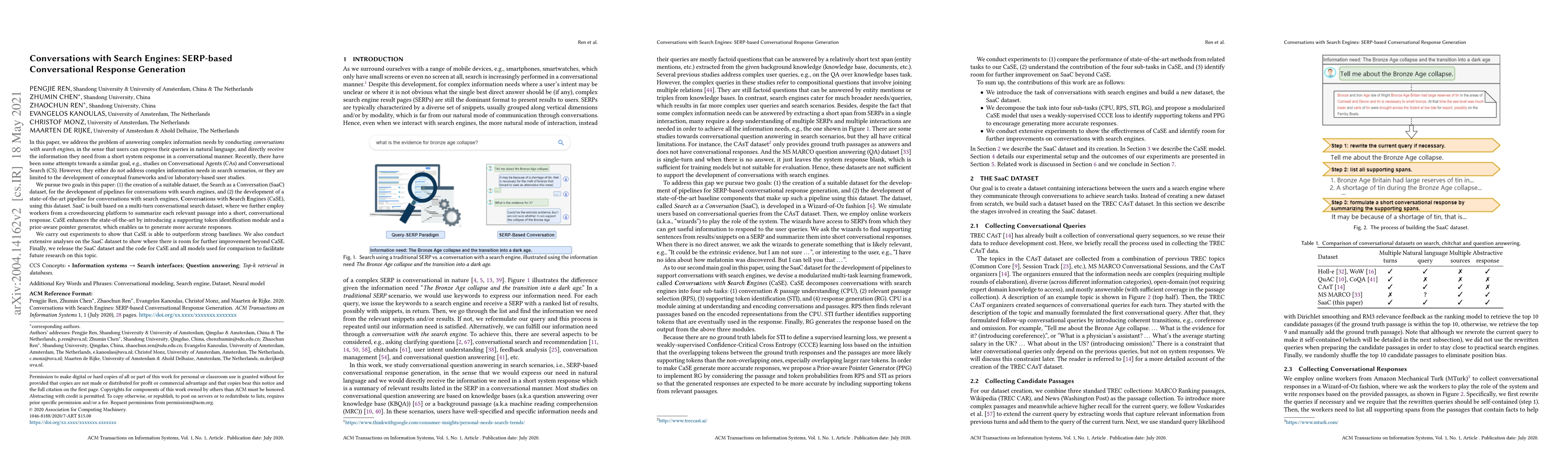 This paper develops a dataset, SaaC, for conversational search and introduces a pipeline, CaSE, to generate conversational responses to complex queries. CaSE outperforms baselines and includes advanced modules for improved accuracy, while the authors release the dataset and code to spur further research.