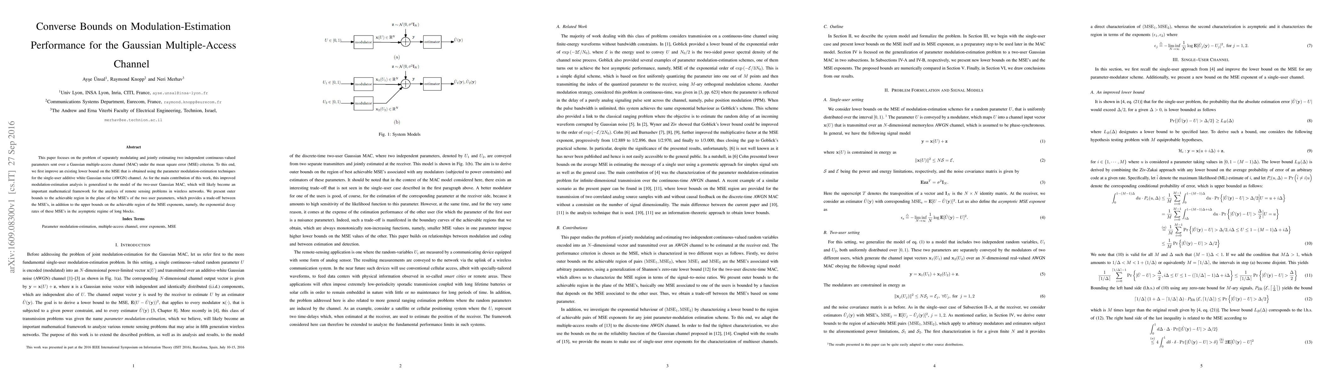 This paper focuses on the problem of separately modulating and jointly estimating two independent continuous-valued parameters sent over a Gaussian multiple-access channel (MAC) under the mean square error (MSE) criterion. To this end, we first improve an existing lower bound on the MSE that is obtained using the parameter modulation-estimation techniques for the single-user additive white Gaussian noise (AWGN) channel. As for the main contribution of this work, this improved modulation-estimation analysis is generalized to the model of the two-user Gaussian MAC, which will likely become an important mathematical framework for the analysis of remote sensing problems in wireless networks. We present outer bounds to the achievable region in the plane of the MSEs of the two user parameters, which provides a trade-off between the MSEs, in addition to the upper bounds on the achievable region of the MSE exponents, namely, the exponential decay rates of these MSEs in the asymptotic regime of long blocks.