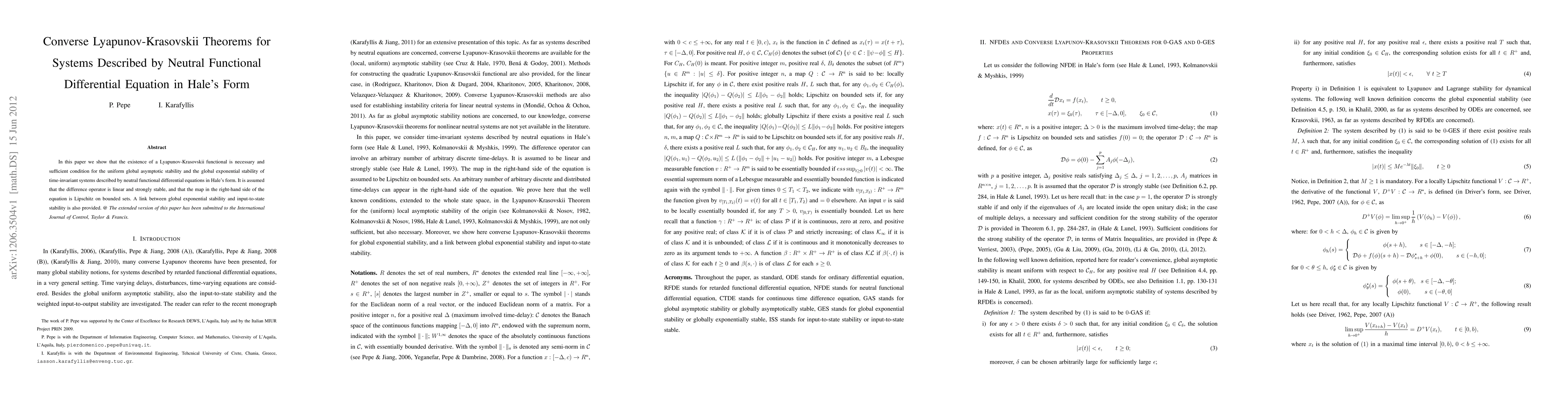 In this paper we show that the existence of a Lyapunov-Krasovskii functional is necessary and sufficient condition for the uniform global asymptotic stability and the global exponential stability of time-invariant systems described by neutral functional differential equations in Hale's form. It is assumed that the difference operator is linear and strongly stable, and that the map in the right-hand side of the equation is Lipschitz on bounded sets. A link between global exponential stability and input-to-state stability is also provided. @ The extended version of this paper has been submitted to the International Journal of Control, Taylor & Francis.