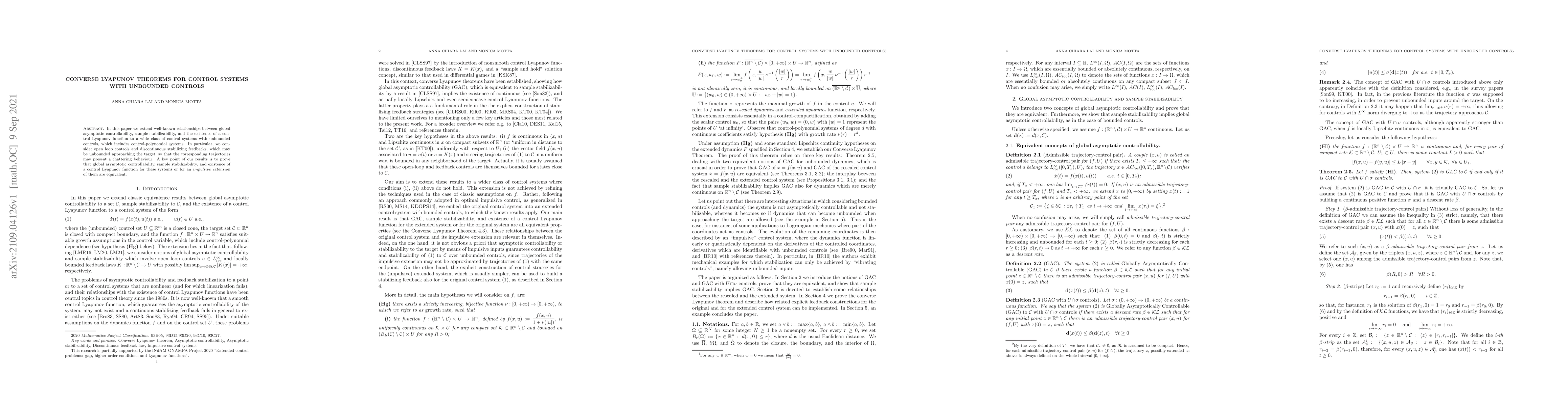 In this paper, we extend well-known relationships between global asymptotic controllability, sample stabilizability, and the existence of a control Lyapunov function to a wide class of control systems with unbounded controls, which includes control-polynomial systems. In particular, we consider open loop controls and discontinuous stabilizing feedbacks, which may be unbounded approaching the target, so that the corresponding trajectories may present a chattering behavior. A key point of our results is to prove that global asymptotic controllability, sample stabilizability, and existence of a control Lyapunov function for these systems or for an {\em impulsive extension} of them are equivalent.