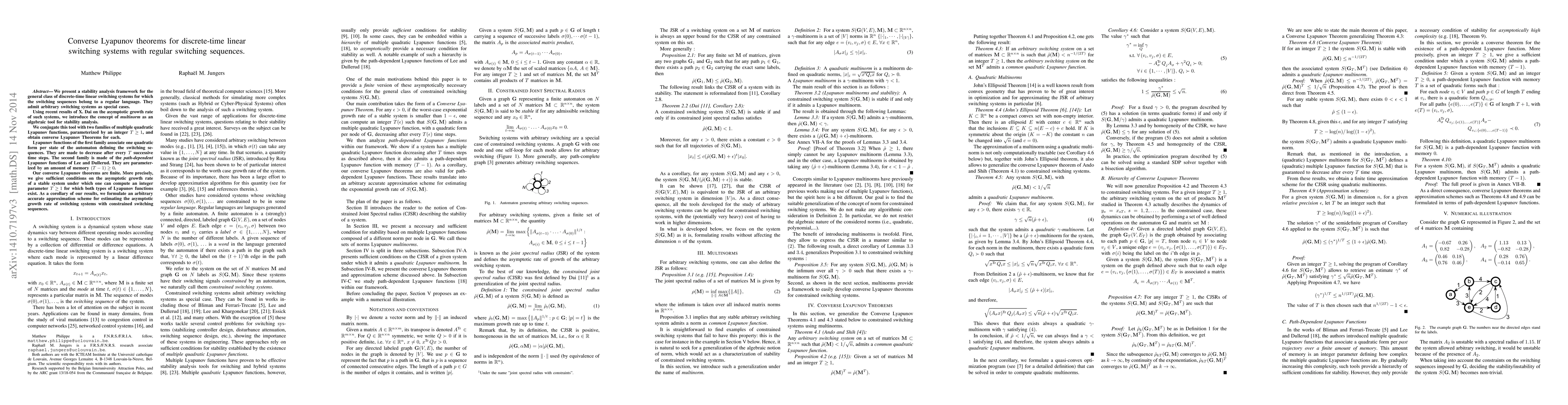 We present a stability analysis framework for the general class of discrete-time linear switching systems for which the switching sequences belong to a regular language. They admit arbitrary switching systems as special cases. Using recent results of X. Dai on the asymptotic growth rate of such systems, we introduce the concept of multinorm as an algebraic tool for stability analysis. We conjugate this tool with two families of multiple quadratic Lyapunov functions, parameterized by an integer T >= 1, and obtain converse Lyapunov Theorems for each. Lyapunov functions of the first family associate one quadratic form per state of the automaton defining the switching sequences. They are made to decrease after every T successive time steps. The second family is made of the path-dependent Lyapunov functions of Lee and Dullerud. They are parameterized by an amount of memory (T-1) >= 0. Our converse Lyapunov theorems are finite. More precisely, we give sufficient conditions on the asymptotic growth rate of a stable system under which one can compute an integer parameter T >= 1 for which both types of Lyapunov functions exist. As a corollary of our results, we formulate an arbitrary accurate approximation scheme for estimating the asymptotic growth rate of switching systems with constrained switching sequences.