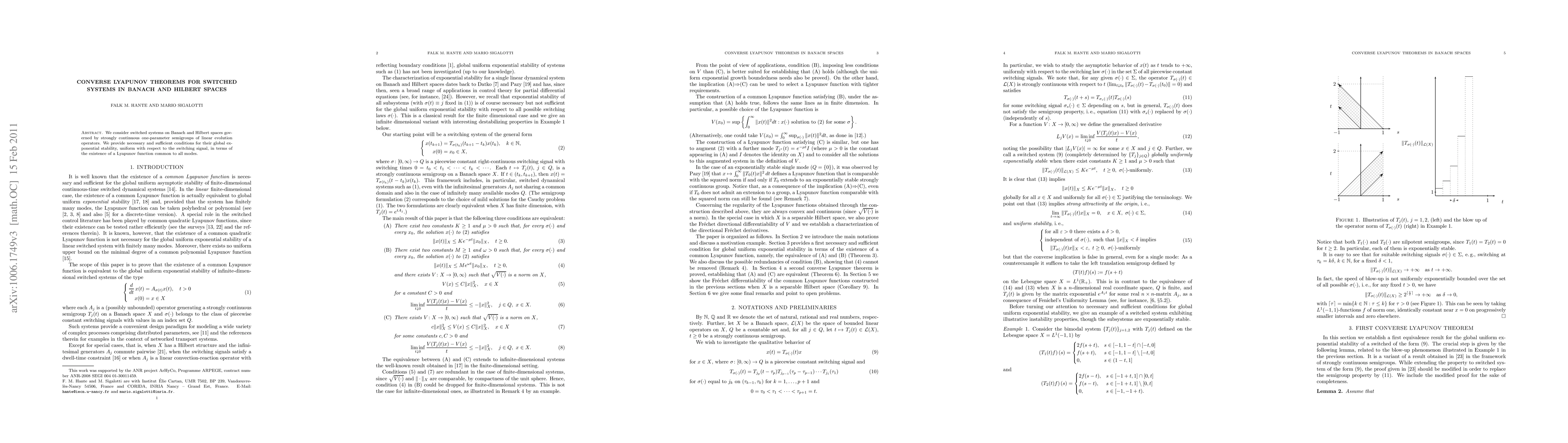 Summary: This paper establishes Converse Lyapunov Theorems for switched systems in Banach and Hilbert spaces, providing necessary and sufficient conditions for global exponential stability through the existence of a common Lyapunov function for all modes.