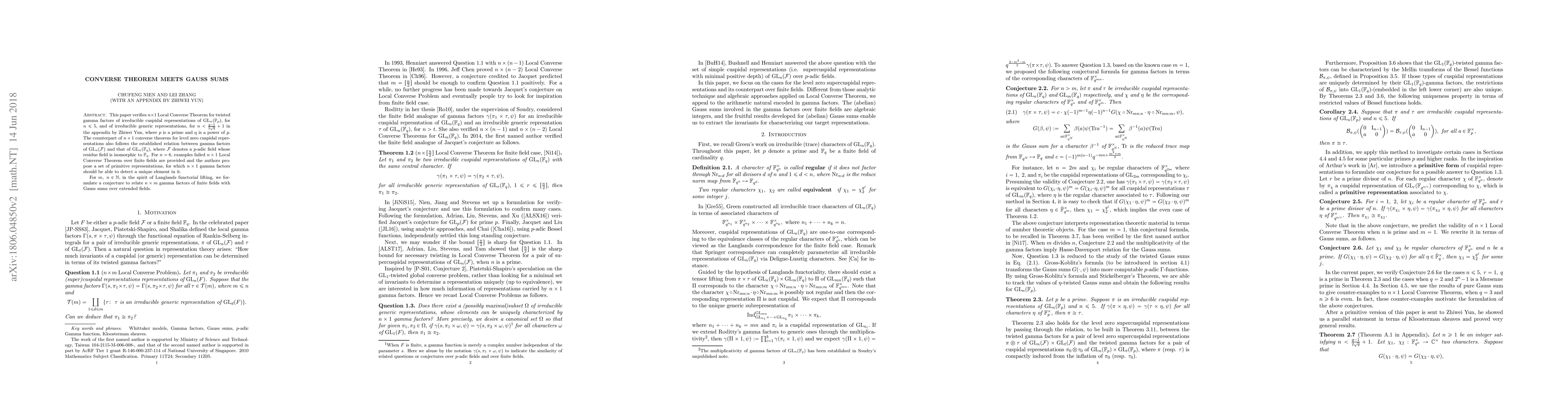 This paper verifies $n\times 1$ Local Converse Theorem for twisted gamma factors of irreducible cuspidal representations of ${\rm GL}_n({\mathbb F}_p)$, for $n\leq 5,$ and of irreducible generic representations, for $n<\frac{q-1}{2\sqrt{q}}+1$ in the appendix by Zhiwei Yun, where $p$ is a prime and q is a power of $p$. The counterpart of $n\times 1$ converse theorem for level zero cuspidal representations also follows the established relation between gamma factors of ${\rm GL}_n({\mathcal F})$ and that of ${\rm GL}_n({\mathbb F}_q)$, where ${\mathcal F}$ denotes a $p$-adic field whose residue field is isomorphic to ${\mathbb F}_q.$ For $n=6,$ examples failed $n\times 1$ Local Converse Theorem over finite fields are provided and the authors propose a set of primitive representations, for which $n\times 1$ gamma factors should be able to detect a unique element in it. For $m,\ n\in {\mathbb N},$ in the spirit of Langlands functorial lifting, we formulate a conjecture to relate $n\times m$ gamma factors of finite fields with Gauss sums over extended fields.