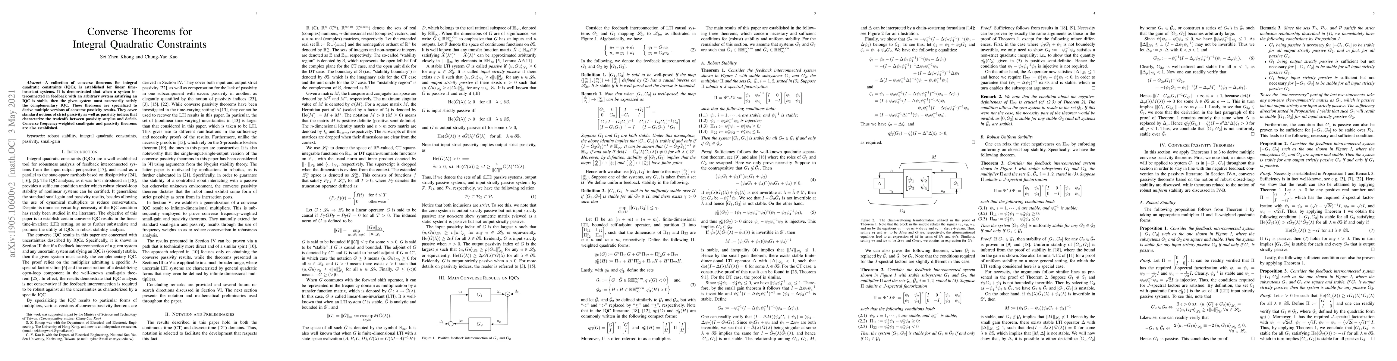 The paper establishes converse theorems for integral quadratic constraints (IQCs) in linear time-invariant systems, showing that stability of an interconnected system implies that the system must satisfy complementary IQCs. It derives specialized converse passivity results including strict passivity and various passivity indices, as well as frequency-weighted small-gain and passivity theorems.