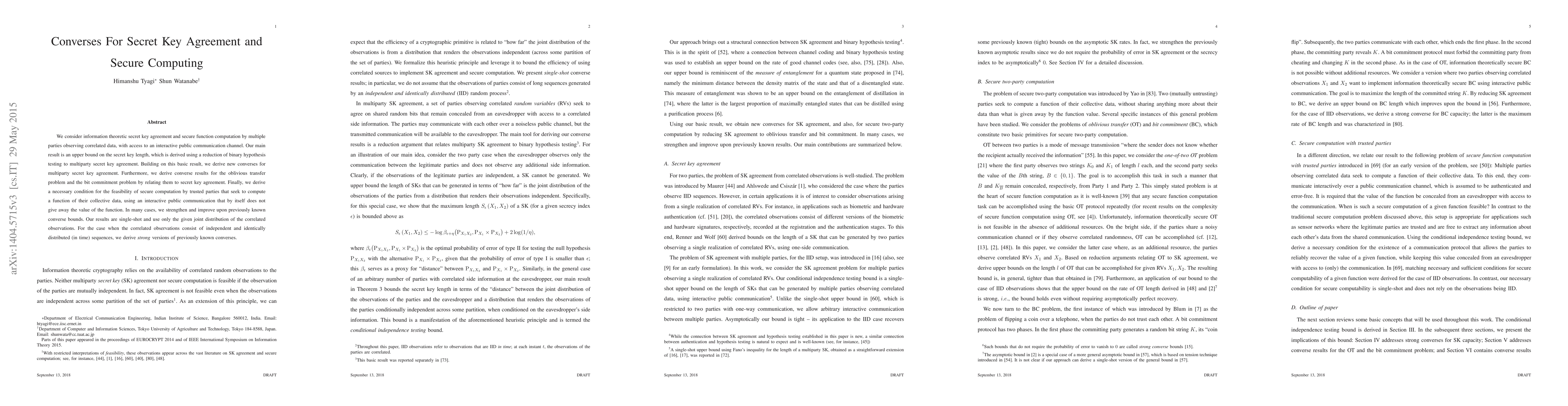 This paper establishes upper bounds on secret key length for multiparty secret key agreement and derives converse results for secure function computation, oblivious transfer, and bit commitment. It introduces necessary conditions for secure computation and improves upon existing converse bounds, all based on the joint distribution of correlated observations.