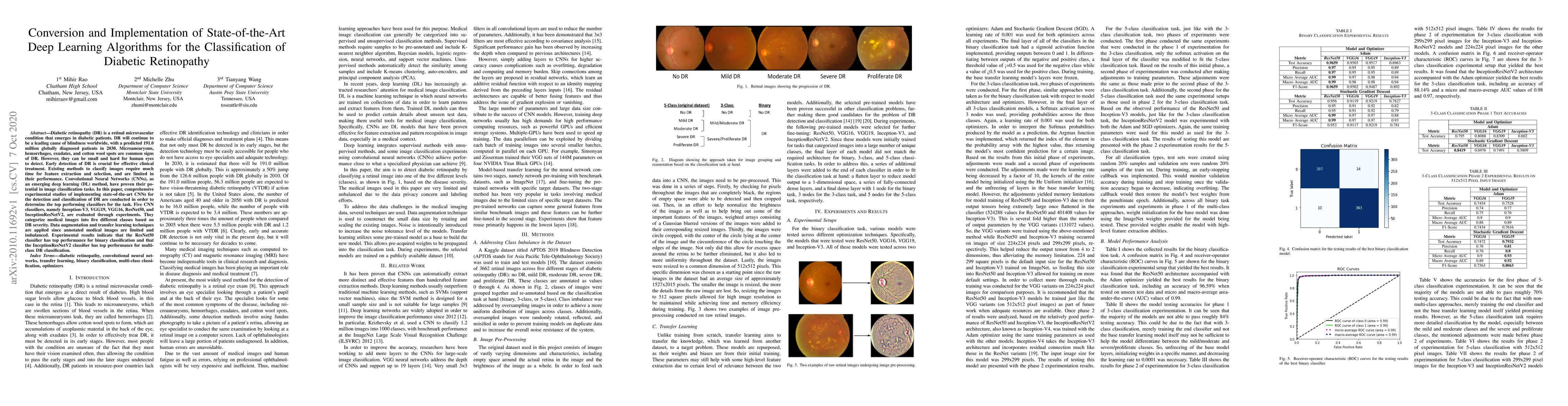 Diabetic retinopathy (DR) is a retinal microvascular condition that emerges in diabetic patients. DR will continue to be a leading cause of blindness worldwide, with a predicted 191.0 million globally diagnosed patients in 2030. Microaneurysms, hemorrhages, exudates, and cotton wool spots are common signs of DR. However, they can be small and hard for human eyes to detect. Early detection of DR is crucial for effective clinical treatment. Existing methods to classify images require much time for feature extraction and selection, and are limited in their performance. Convolutional Neural Networks (CNNs), as an emerging deep learning (DL) method, have proven their potential in image classification tasks. In this paper, comprehensive experimental studies of implementing state-of-the-art CNNs for the detection and classification of DR are conducted in order to determine the top performing classifiers for the task. Five CNN classifiers, namely Inception-V3, VGG19, VGG16, ResNet50, and InceptionResNetV2, are evaluated through experiments. They categorize medical images into five different classes based on DR severity. Data augmentation and transfer learning techniques are applied since annotated medical images are limited and imbalanced. Experimental results indicate that the ResNet50 classifier has top performance for binary classification and that the InceptionResNetV2 classifier has top performance for multi-class DR classification.