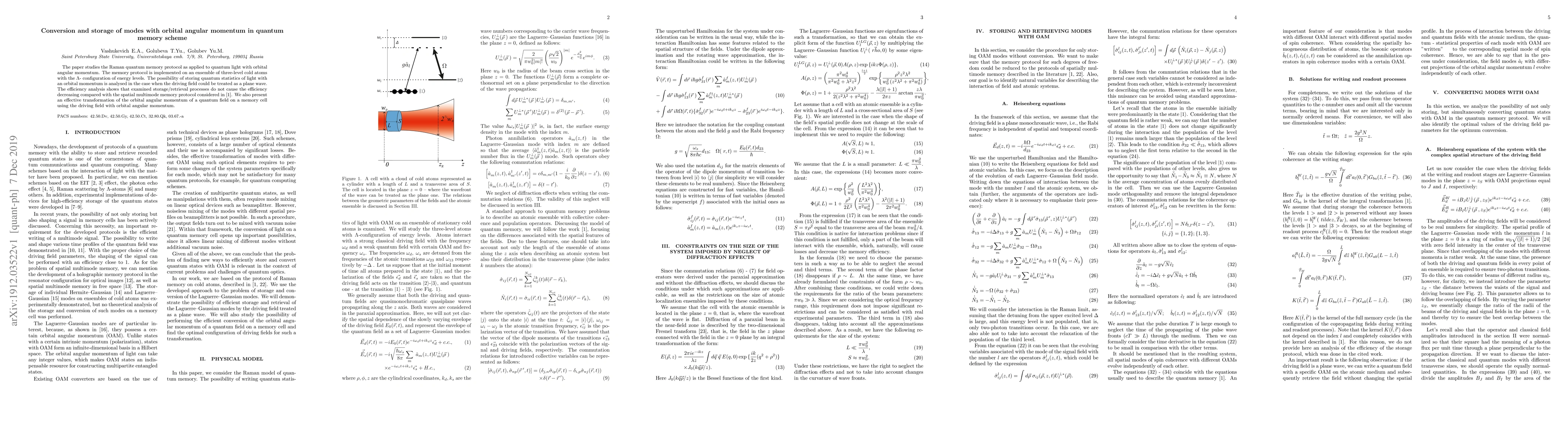 The paper studies the Raman quantum memory protocol as applied to quantum light with orbital angular momentum. The memory protocol is implemented on an ensemble of three-level cold atoms with the $\Lambda$- configuration of energy levels. The possibility of storing quantum statistics of light with an orbital momentum is analysed in the case when the driving field could be treated as a plane wave. The efficiency analysis shows that examined storage/retrieval processes do not cause the efficiency decreasing compared with the spatial multimode memory protocol considered in [Golubeva et al. 2012]]. We also present an effective transformation of the orbital angular momentum of a quantum field on a memory cell using the driving field with orbital angular momentum.