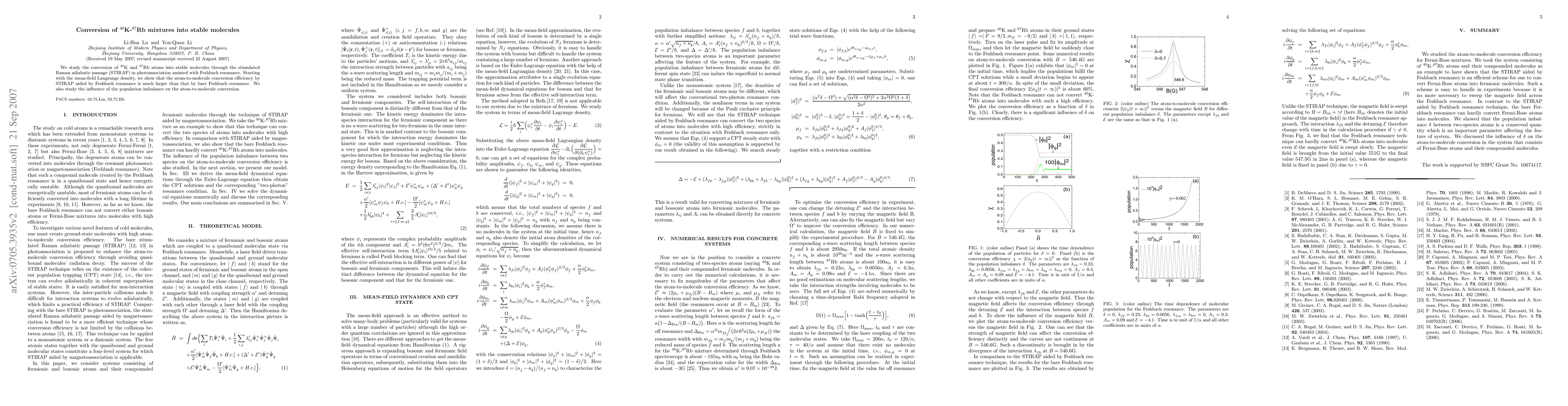 This paper investigates the conversion of $^{40}$K and $^{87}$Rb atoms into stable molecules using STIRAP enhanced by Feshbach resonance, demonstrating significantly higher conversion efficiency compared to Feshbach resonance alone. It also explores the effect of population imbalance on this conversion process.