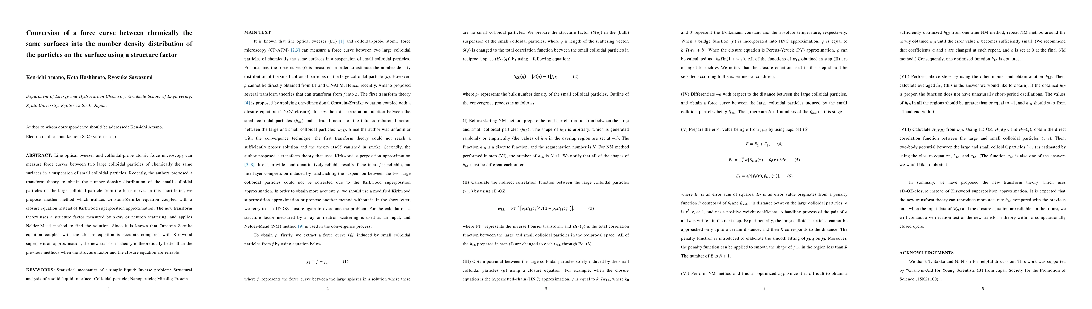 This paper presents a new method to convert force curves between chemically identical surfaces into the number density distribution of particles on the surface, using a structure factor and the Ornstein-Zernike equation coupled with a closure equation. This approach is theoretically superior to previous methods based on the Kirkwood superposition approximation.