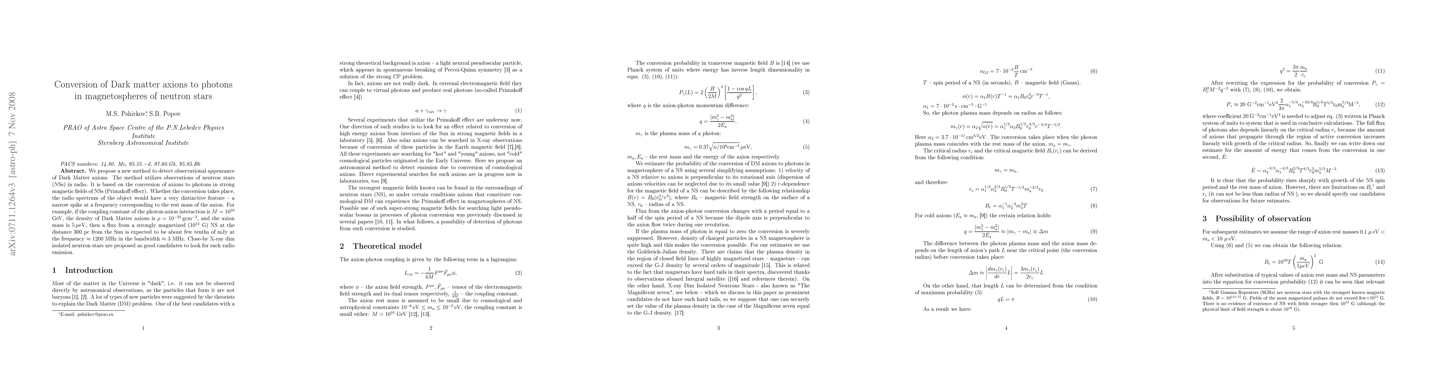 We propose a new method to detect observational appearance of Dark Matter axions. The method utilizes observations of neutron stars (NSs) in radio. It is based on the conversion of axions to photons in strong magnetic fields of NSs (Primakoff effect). Whether the conversion takes place, the radio spectrum of the object would have a very distinctive feature -- a narrow spike at a frequency corresponding to the rest mass of the axion. For example, if the coupling constant of the photon-axion interaction is $M=10^{10}$ GeV, the density of Dark Matter axions is $\rho=10^{-24} {\rm g cm^{-3}}$, and the axion mass is $5 {\rm \mu eV}$, then a flux from a strongly magnetized ($10^{14}$ G) NS at the distance 300 pc from the Sun is expected to be about few tenths of mJy at the frequency $\approx 1200$ MHz in the bandwidth $\approx 3$ MHz. Close-by X-ray dim isolated neutron stars are proposed as good candidates to look for such radio emission.