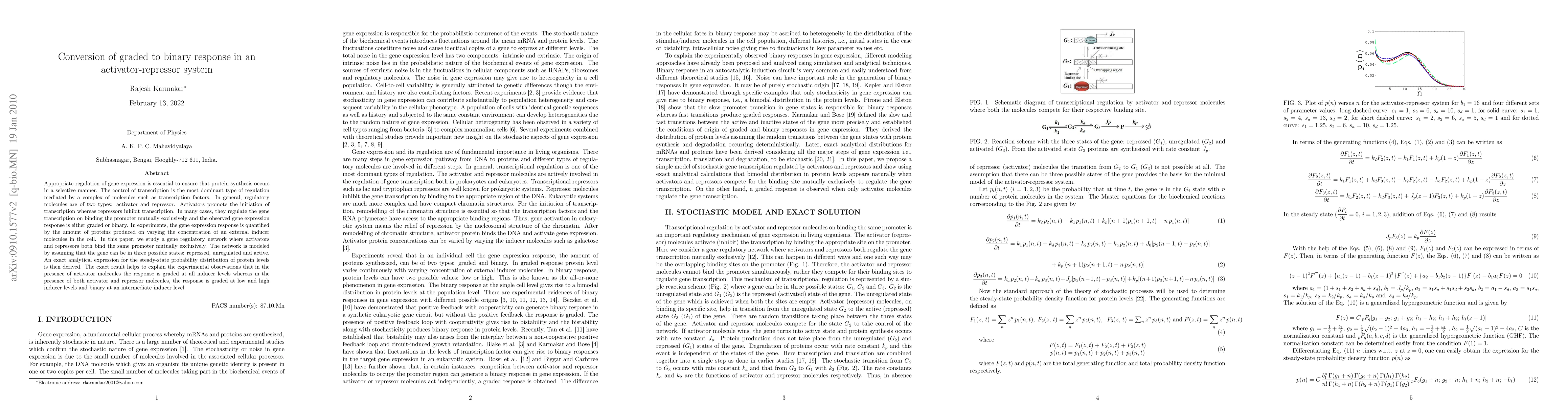 This paper investigates a gene regulatory network where activators and repressors mutually exclusively bind the same promoter, modeling the gene in three states: repressed, unregulated, and active. It derives an analytical expression for the steady-state probability distribution of protein levels, explaining the graded and binary responses observed in experiments based on inducer concentrations.