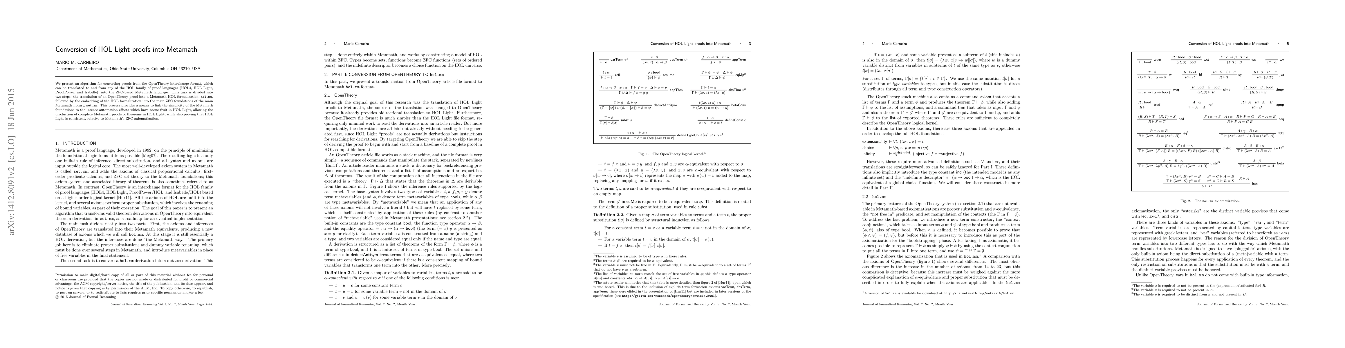 This paper proposes an algorithm to convert HOL Light proofs into the Metamath language, involving two steps: translating OpenTheory proofs to a Metamath HOL formalization and then embedding it into Metamath's ZFC foundations, thus linking HOL Light's automation to Metamath's simplicity and proving HOL Light's consistency relative to Metamath's ZFC.