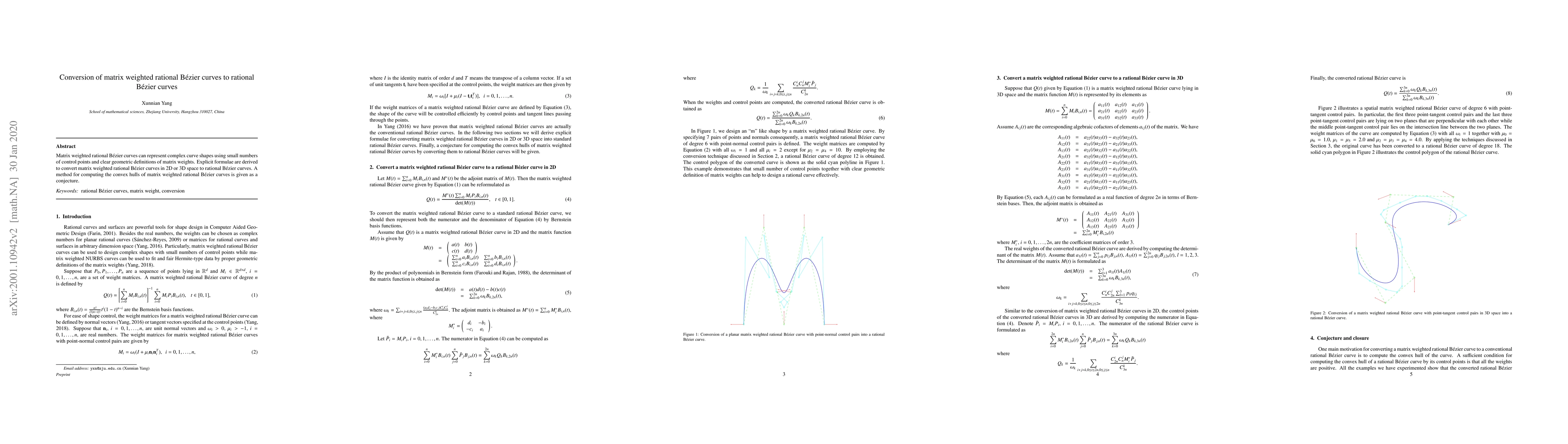 The paper presents novel formulae and a conversion method for transforming matrix weighted rational Bézier curves into standard rational Bézier curves, along with a conjecture for convex hull computation.