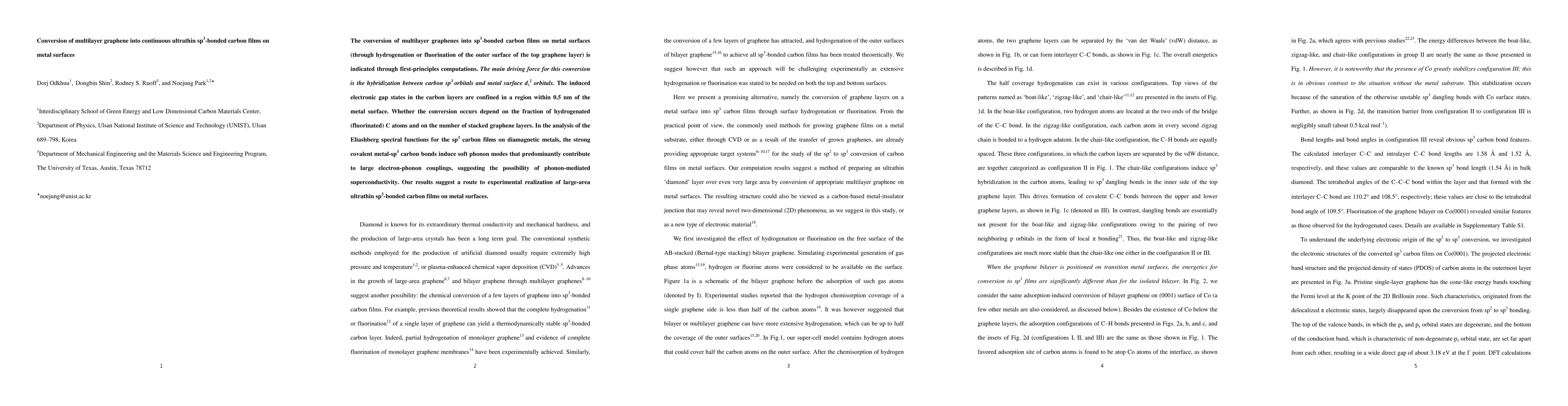 This paper demonstrates the conversion of multilayer graphene into ultrathin sp^3-bonded carbon films on metal surfaces via hydrogenation or fluorination, driven by hybridization between carbon and metal surface orbitals. The potential for phonon-mediated superconductivity is suggested due to strong covalent metal-carbon bonds.