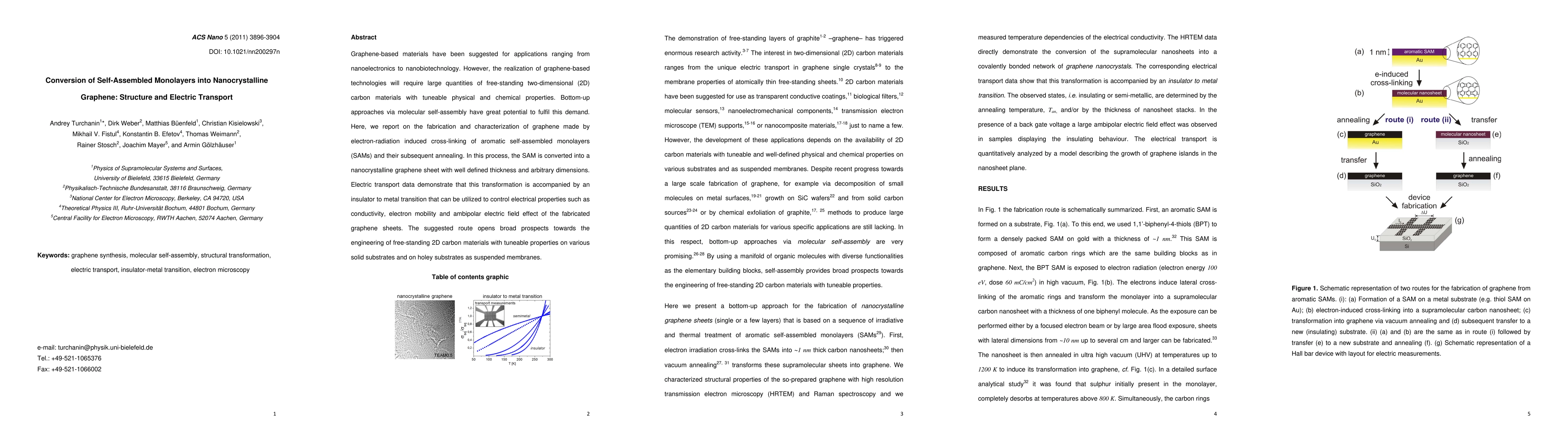 This paper details the conversion of self-assembled monolayers into nanocrystalline graphene through electron-radiation induced cross-linking and annealing, achieving a tunable insulator-to-metal transition that enhances electrical properties. This method offers a scalable route for creating free-standing 2D carbon materials with customizable dimensions and properties.