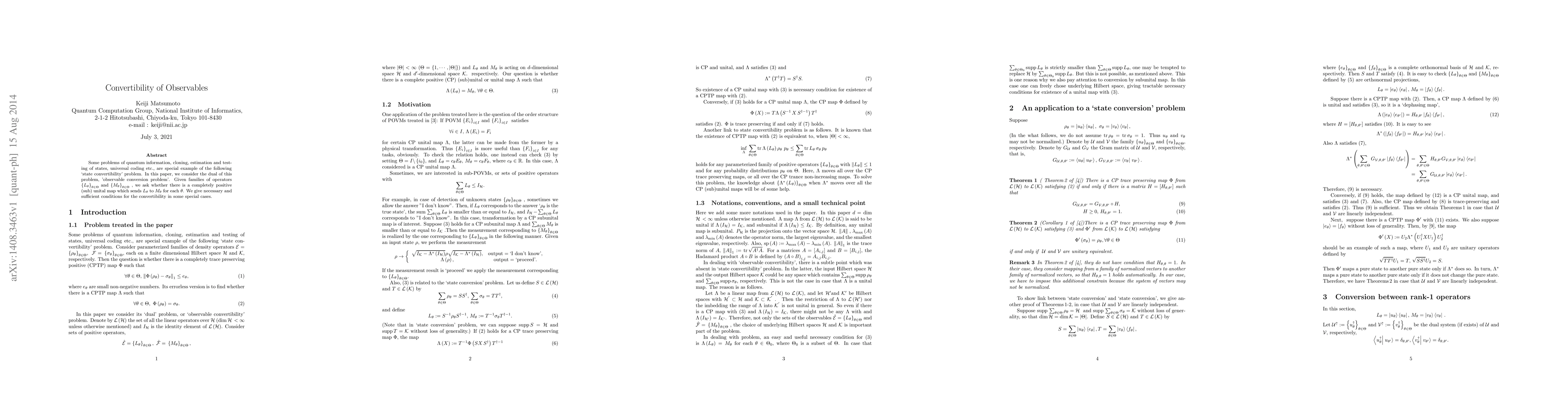 Some problems of quantum information, cloning, estimation and testing of states, universal coding etc., are special example of the following `state convertibility' problem. In this paper, we consider the dual of this problem, 'observable conversion problem'. Given families of operators $\{L_\theta}\}_{\theta\in\Theta}$ and $\{M_\theta}\}_{\theta\in\Theta}$ , we ask whether there is a completely positive (sub) unital map which sends $\{L_\theta}\}$ to $\{M_\theta}\}$ for each {\theta}. We give necessary and sufficient conditions for the convertibility in some special cases.