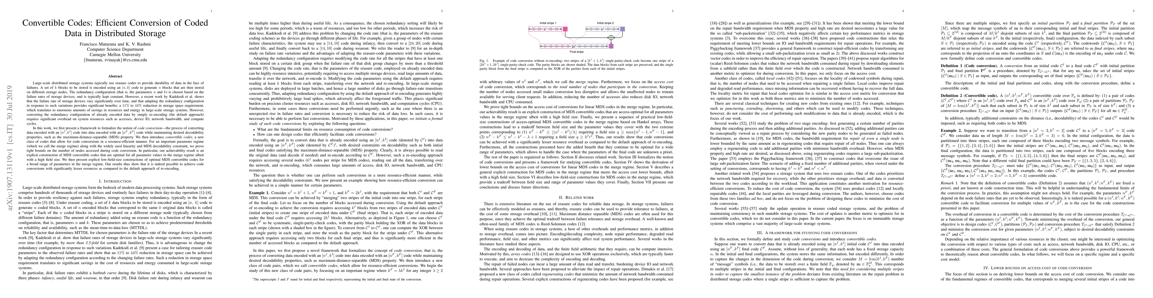 This paper introduces convertible codes, a novel class of erasure codes designed to efficiently convert existing encoded data in distributed storage systems to adapt to changing failure rates. The authors propose a framework for code conversion and present explicit constructions of optimal maximum-distance-separable (MDS) convertible codes, demonstrating significant resource savings compared to traditional re-encoding methods.