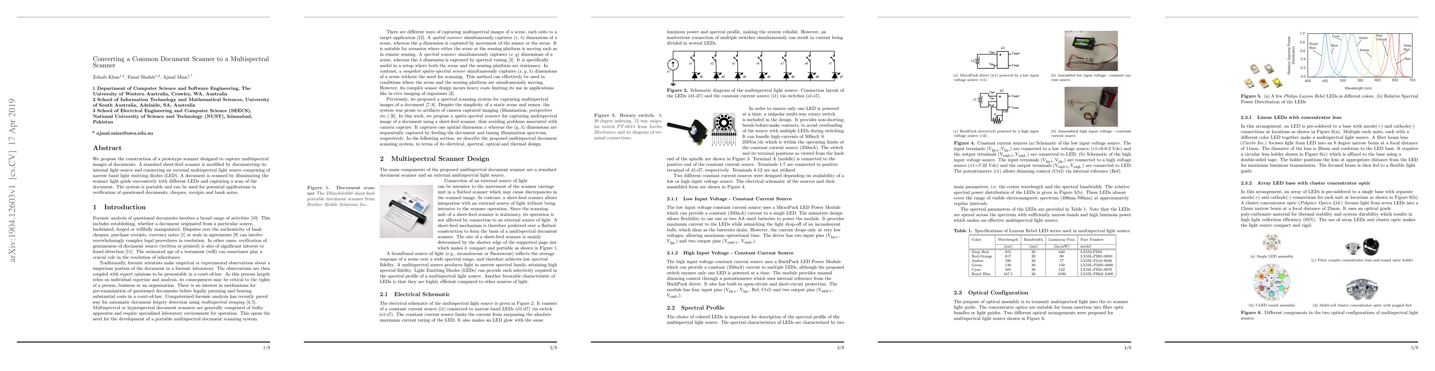 This paper details the modification of a standard document scanner into a multispectral scanner using external narrow band LEDs, enabling it to capture multispectral images for applications like document verification. The portable prototype shows potential for use in verifying questioned documents, cheques, receipts, and bank notes.