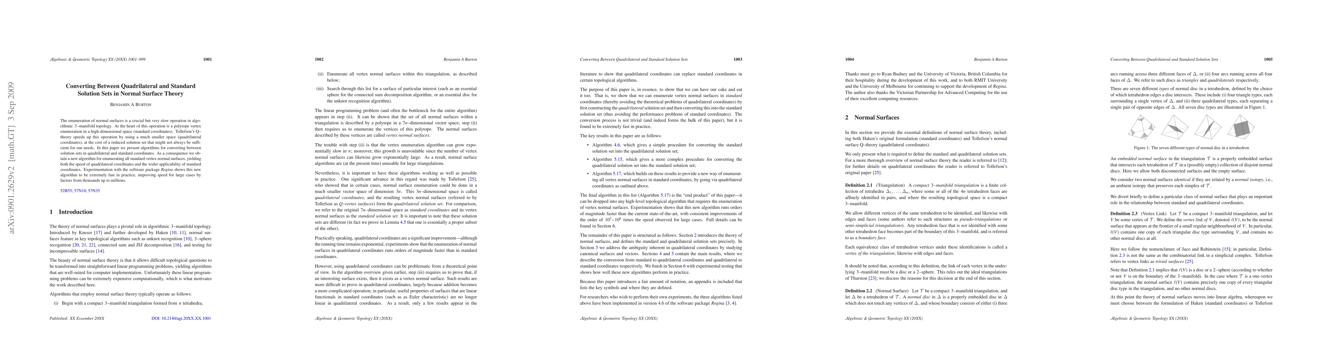 Researchers have developed algorithms to convert between normal surface solution sets in quadrilateral and standard coordinates, yielding a fast algorithm for enumerating all standard vertex surfaces.