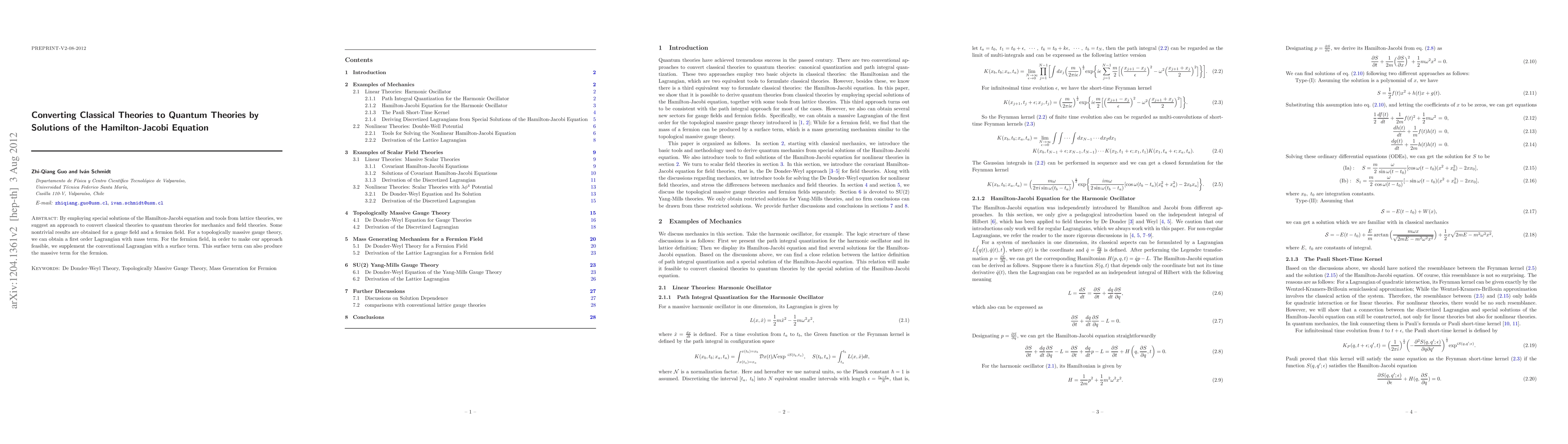 This paper proposes a method to convert classical mechanics and field theories into quantum theories by utilizing special solutions of the Hamilton-Jacobi equation and lattice theory techniques. It successfully derives a first-order Lagrangian with a mass term for a topologically massive gauge theory and introduces a surface term in the fermion field Lagrangian to achieve a massive fermion.