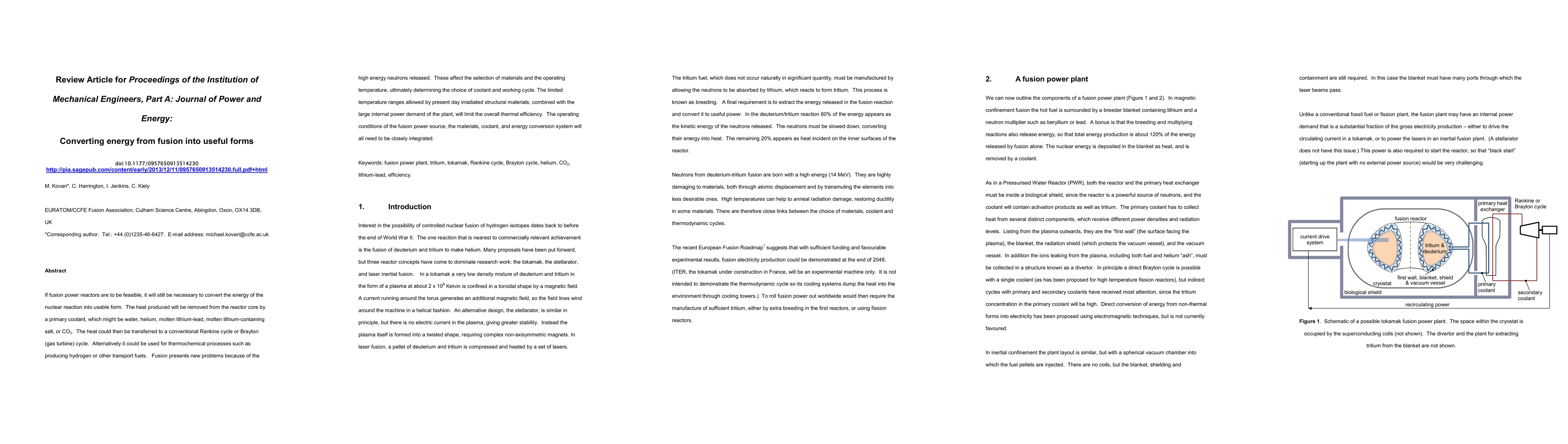 If fusion power reactors are to be feasible, it will still be necessary to convert the energy of the nuclear reaction into usable form. The heat produced will be removed from the reactor core by a primary coolant, which might be water, helium, molten lithium-lead, molten lithium-containing salt, or CO2. The heat could then be transferred to a conventional Rankine cycle or Brayton (gas turbine) cycle. Alternatively it could be used for thermochemical processes such as producing hydrogen or other transport fuels. Fusion presents new problems because of the high energy neutrons released. These affect the selection of materials and the operating temperature, ultimately determining the choice of coolant and working cycle. The limited temperature ranges allowed by present day irradiated structural materials, combined with the large internal power demand of the plant, will limit the overall thermal efficiency. The operating conditions of the fusion power source, the materials, coolant, and energy conversion system will all need to be closely integrated.