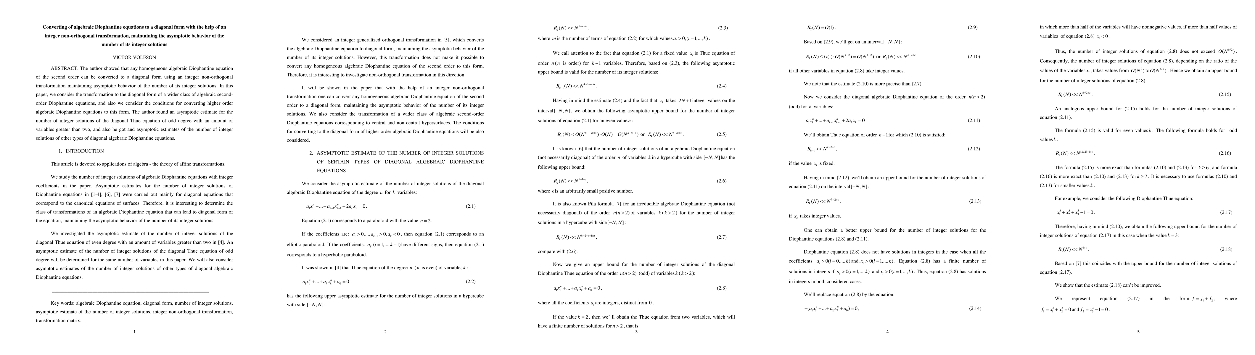 The author showed that any homogeneous algebraic Diophantine equation of the second order can be converted to a diagonal form using an integer non-orthogonal transformation maintaining asymptotic behavior of the number of its integer solutions. In this paper, we consider the transformation to the diagonal form of a wider class of algebraic second-order Diophantine equations, and also we consider the conditions for converting higher order algebraic Diophantine equations to this form. The author found an asymptotic estimate for the number of integer solutions of the diagonal Thue equation of odd degree with an amount of variables greater than two, and also he got and asymptotic estimates of the number of integer solutions of other types of diagonal algebraic Diophantine equations.