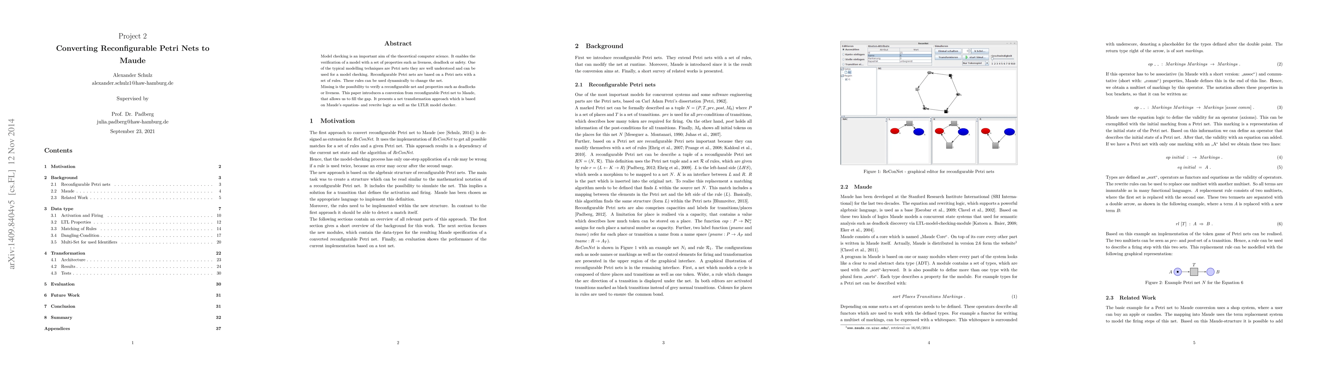 This paper presents a method to convert reconfigurable Petri nets into Maude, enabling verification of properties like deadlocks and liveness. The transformation leverages Maude’s equation- and rewrite logic, along with the LTLR model checker for effective model checking.