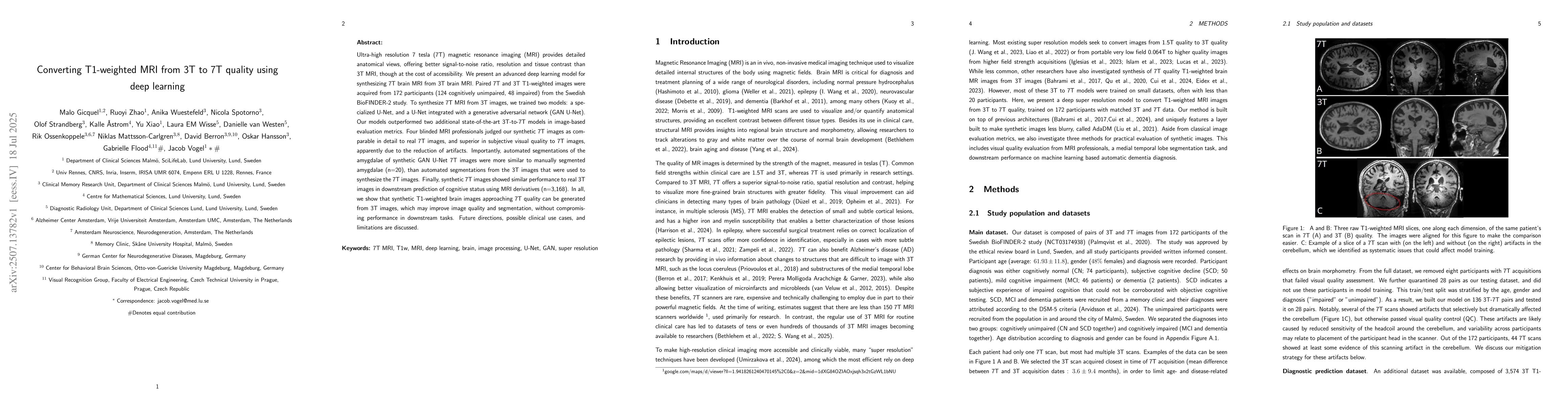 The paper introduces an advanced deep learning model combining U-Net with GAN for synthesizing high-resolution 7T MRI from 3T MRI, outperforming existing models in image quality and segmentation accuracy.