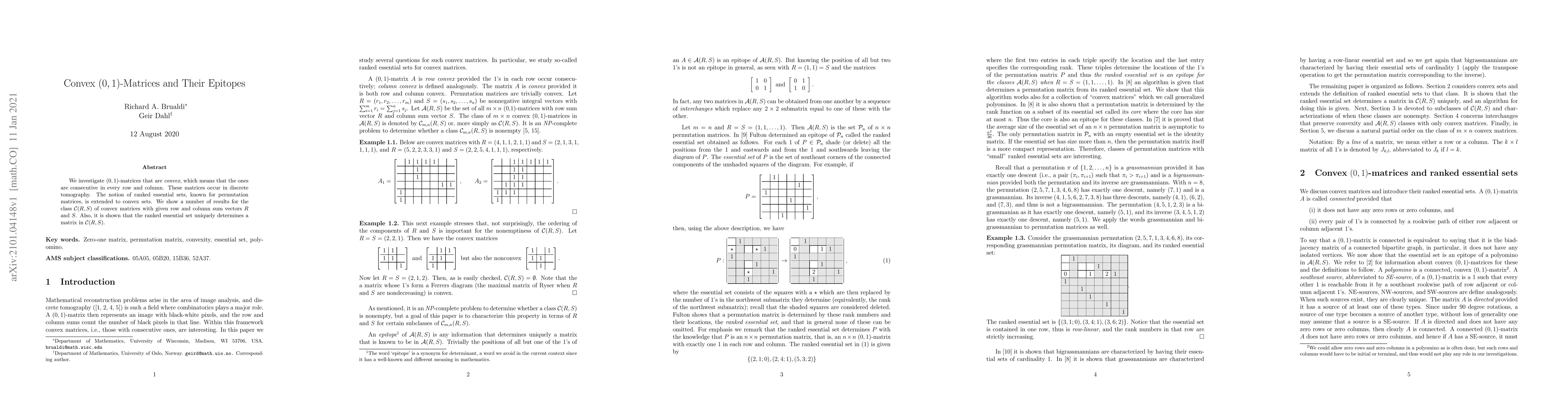 This paper explores convex $(0,1)$-matrices where ones are consecutive in each row and column, relevant in discrete tomography. It extends the concept of ranked essential sets from permutation matrices to convex sets and demonstrates that the ranked essential set uniquely identifies a matrix in the class $\mc{C}(R,S)$.