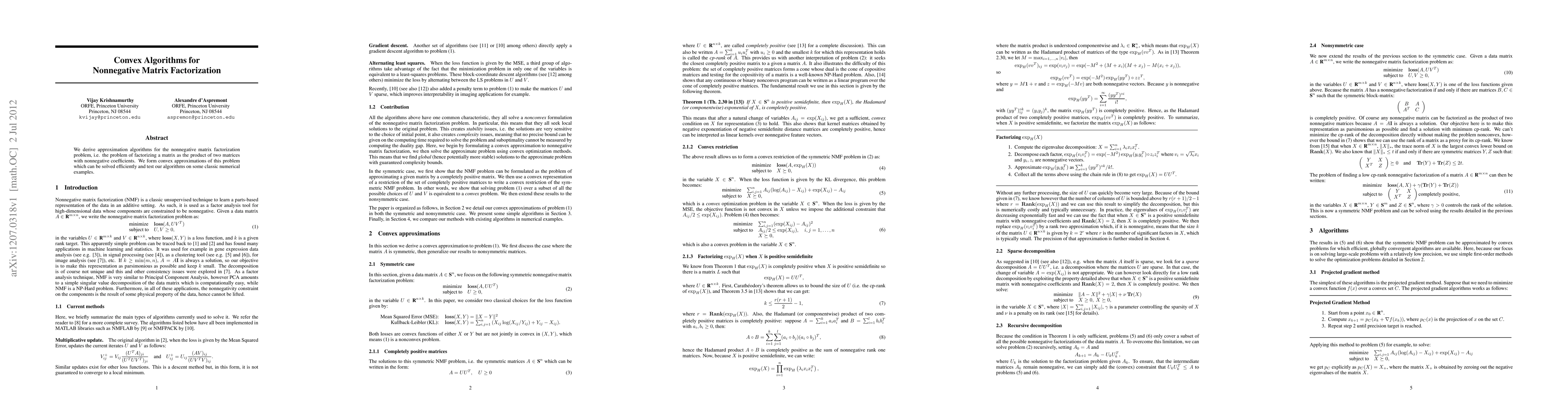 The paper derives convex approximation algorithms for the nonnegative matrix factorization problem, forming it as a convex optimization problem that can be solved efficiently. It tests the algorithms on classic numerical examples.