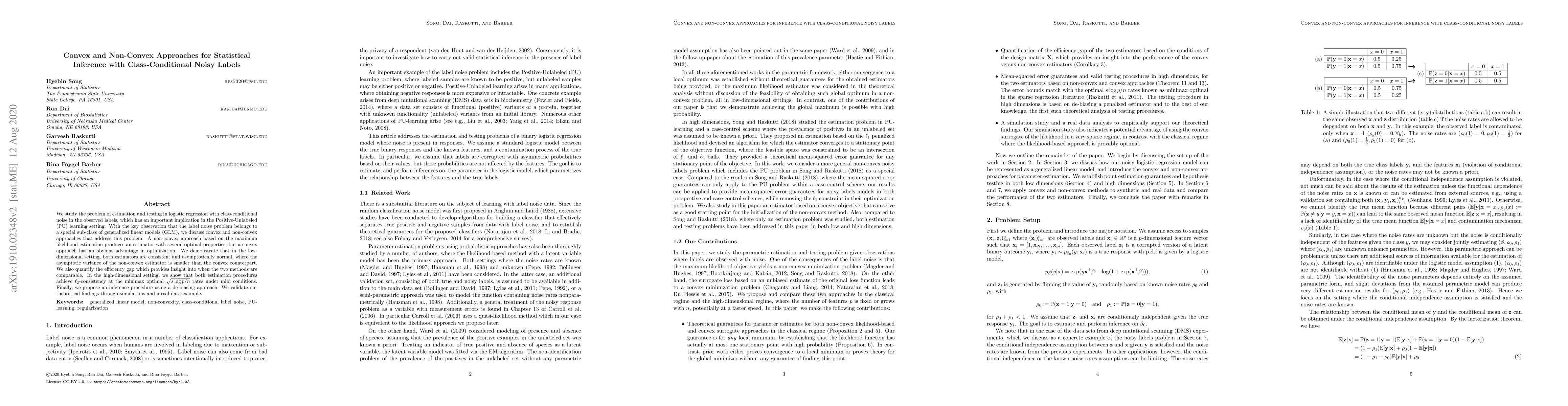 This research investigates estimation and testing in logistic regression with class-conditional noisy labels, crucial for Positive-Unlabeled (PU) learning. It compares convex and non-convex methods, finding that while both are consistent and efficient in low dimensions, the non-convex estimator has a smaller asymptotic variance. In high dimensions, both methods achieve minimax optimal rates. A de-biasing approach for inference is also proposed, supported by simulations and real-data examples.