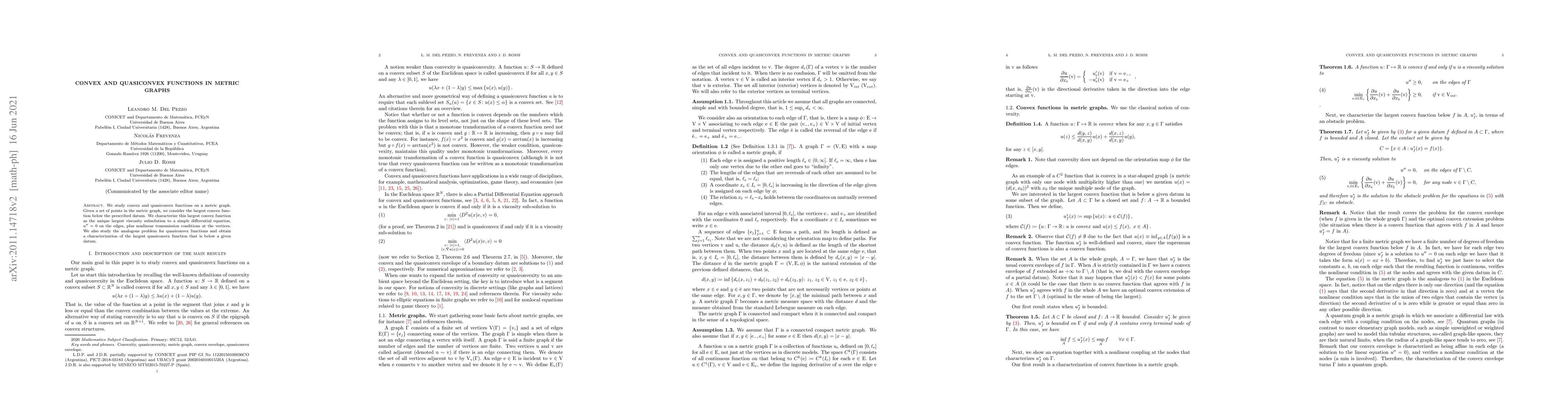 The paper studies convex and quasiconvex functions on a metric graph, characterizing the largest convex function below prescribed data and the largest quasiconvex function below a given datum using viscosity subsolutions and supersolutions.