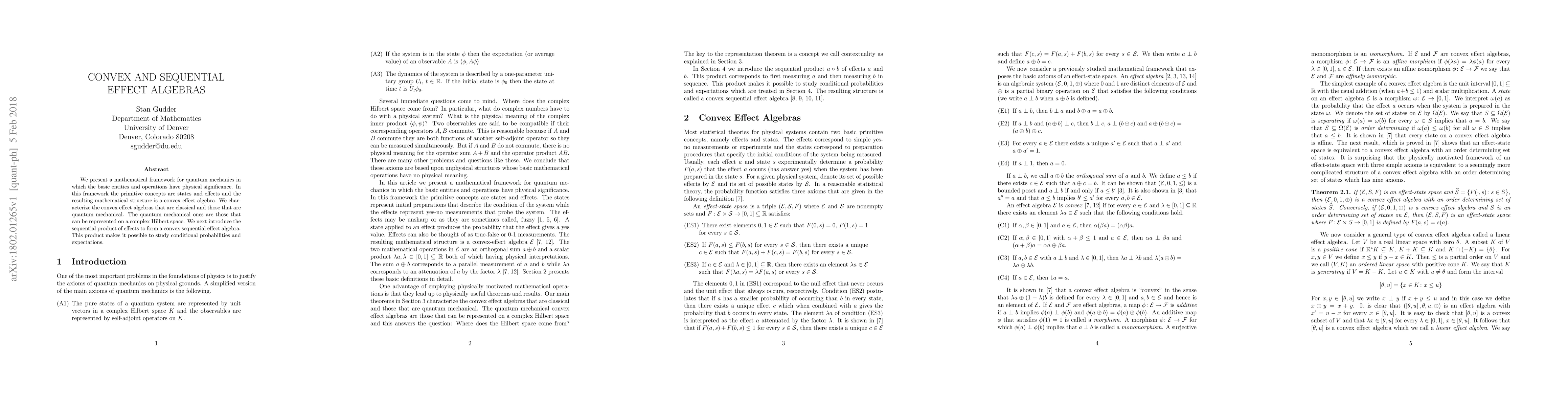 This paper develops a mathematical framework for quantum mechanics using convex effect algebras, distinguishing between classical and quantum mechanical structures based on their representation on complex Hilbert spaces. It introduces a sequential product to form convex sequential effect algebras, enabling the study of conditional probabilities and expectations.