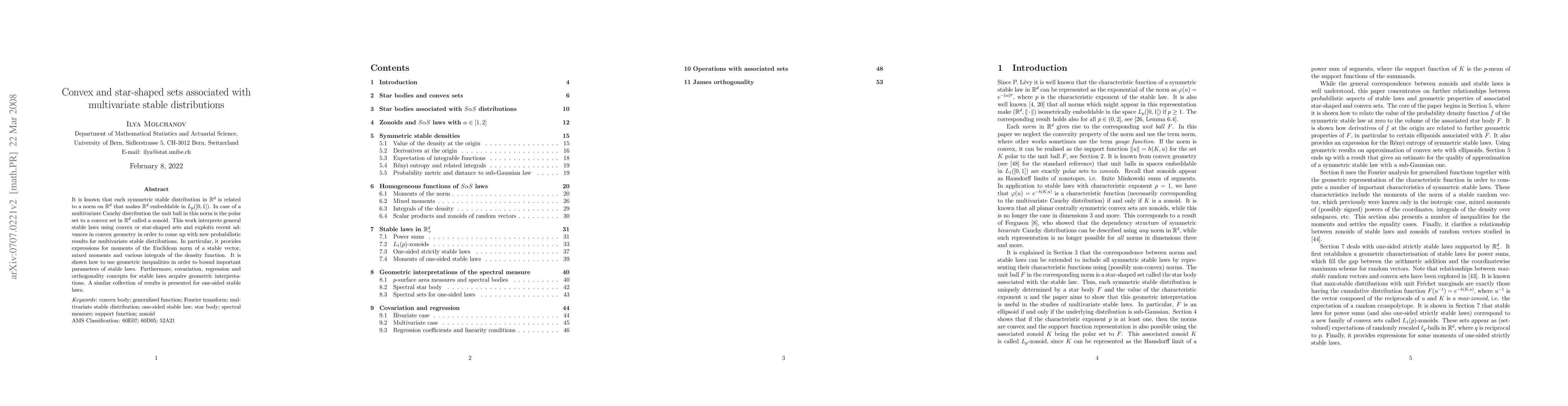 This paper explores the relationship between symmetric stable distributions and convex or star-shaped sets, leveraging recent geometric advances to derive new probabilistic results. It provides expressions for moments and mixed moments of stable vectors, and uses geometric inequalities to bound parameters, showing each stable law as a limit of sub-Gaussian laws.