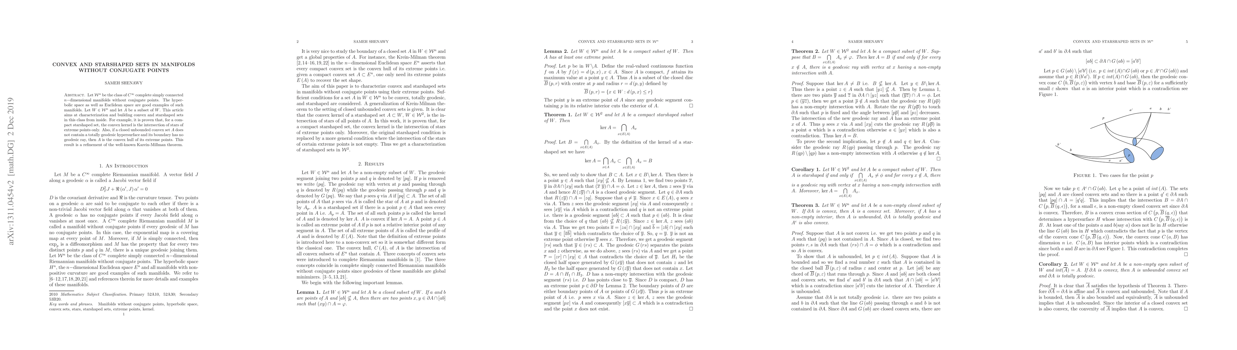 This paper explores the construction and characterization of convex and starshaped sets within $C^{\infty}$ complete simply connected manifolds without conjugate points, proving that compact starshaped sets have a convex kernel defined by the intersection of stars of extreme points. It also refines the Karein-Millman theorem by showing that certain closed unbounded convex sets are the convex hull of their extreme points.