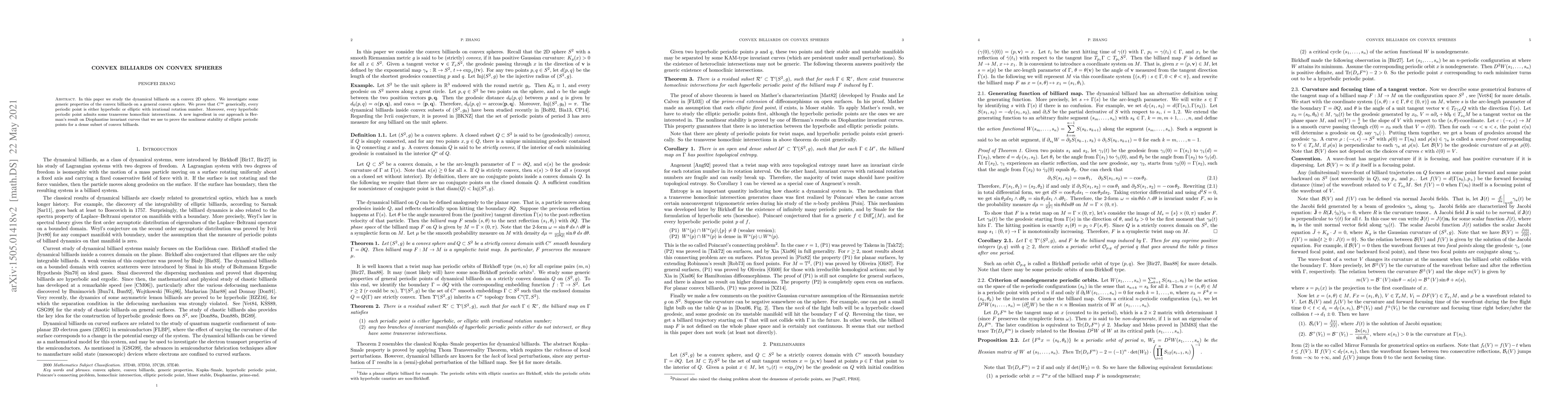 In this paper we study the dynamical billiards on a convex 2D sphere. We investigate some generic properties of the convex billiards on a general convex sphere. We prove that $C^\infty$ generically, every periodic point is either hyperbolic or elliptic with irrational rotation number. Moreover, every hyperbolic periodic point admits some transverse homoclinic intersections. A new ingredient in our approach is that we use Herman's result on Diophantine invariant curves to prove the nonlinear stability of elliptic periodic points for a dense subset of convex billiards.