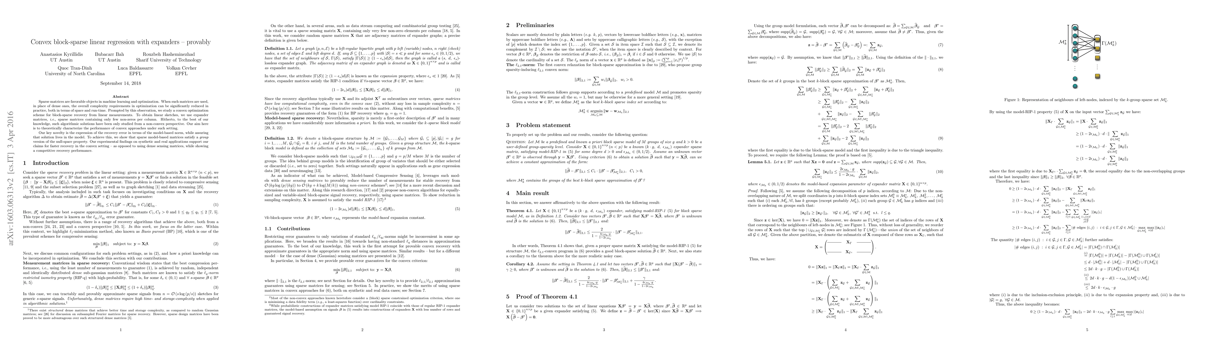This paper investigates convex optimization for block-sparse linear regression using expander matrices, demonstrating theoretically that sparse model-based matrices satisfy a group null-space property. Experimental results show faster recovery and competitive performance compared to dense matrices.