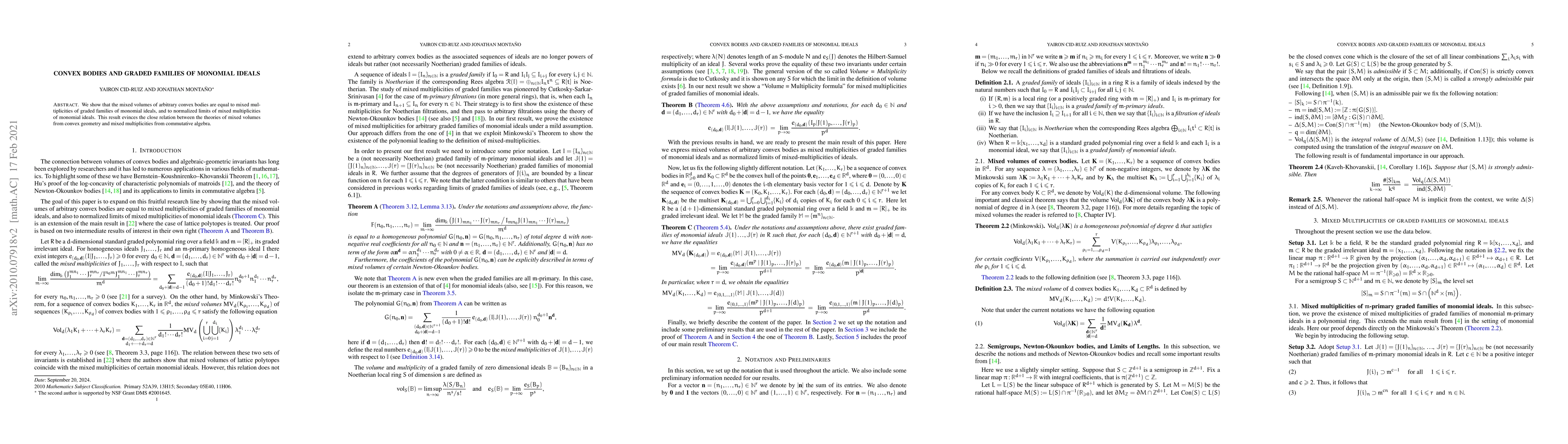 This paper establishes an equivalence between mixed volumes of convex bodies and mixed multiplicities of graded families of monomial ideals, highlighting a profound connection between convex geometry and commutative algebra.