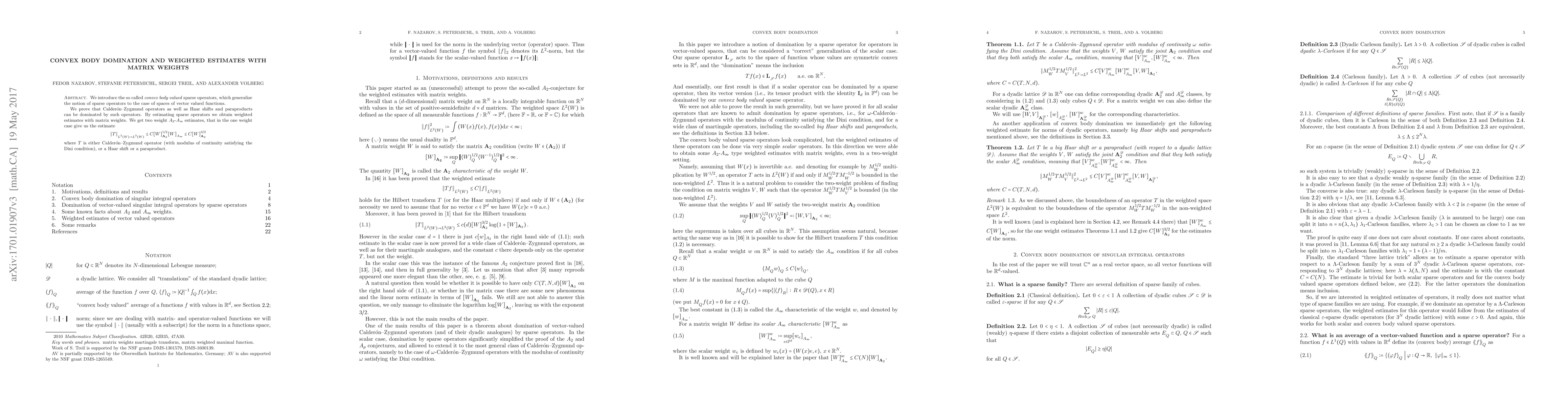 We introduce the so called convex body valued sparse operators, which generalize the notion of sparse operators to the case of spaces of vector valued functions. We prove that Calder\'on--Zygmund operators as well as Haar shifts and paraproducts can be dominated by such operators. By estimating sparse operators we obtain weighted estimates with matrix weights. We get two weight $A_2$-$A_\infty$ estimates, that in the one weight case give us the estimate $$ \|T\|_{L^2(W)\to L^2 (W)} \le C [W]_{A_2}^{1/2} [W]_{A_\infty} \le C[W]_{A_2}^{3/2} $$ where $T$ is either a Calderon--Zygmund operator (with modulus of continuity satisfying the Dini condition), or a Haar shift or a paraproduct.