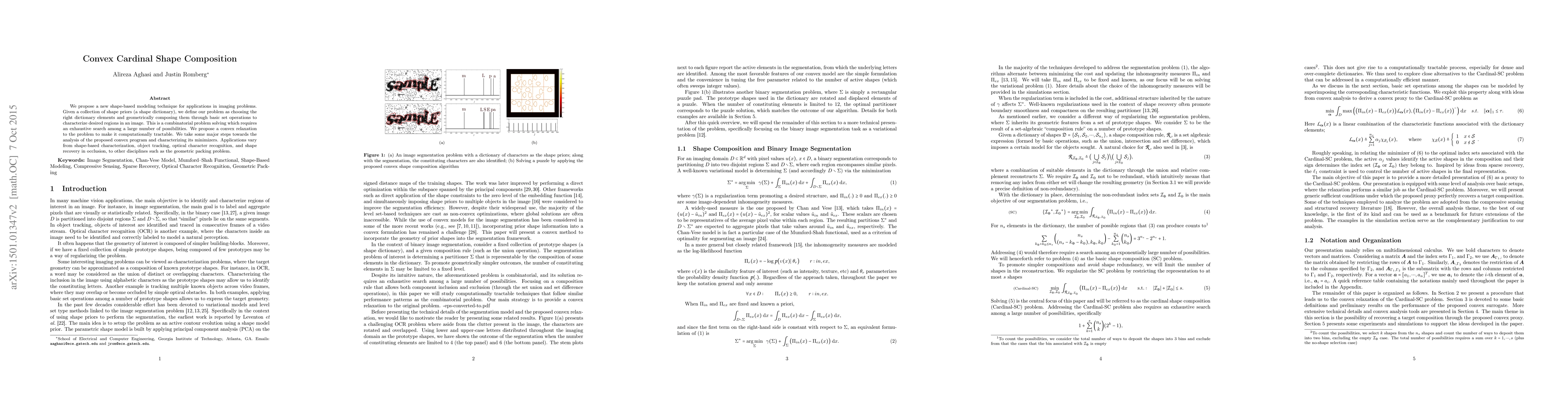 We propose a new shape-based modeling technique for applications in imaging problems. Given a collection of shape priors (a shape dictionary), we define our problem as choosing the right dictionary elements and geometrically composing them through basic set operations to characterize desired regions in an image. This is a combinatorial problem solving which requires an exhaustive search among a large number of possibilities. We propose a convex relaxation to the problem to make it computationally tractable. We take some major steps towards the analysis of the proposed convex program and characterizing its minimizers. Applications vary from shape-based characterization, object tracking, optical character recognition, and shape recovery in occlusion, to other disciplines such as the geometric packing problem.