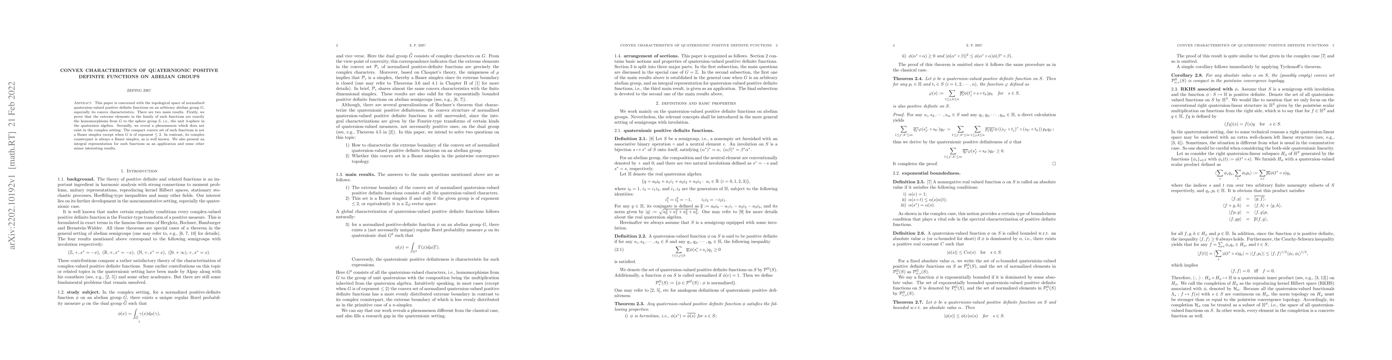 This paper investigates the convex properties of normalized quaternion-valued positive definite functions on abelian groups, proving that extreme elements are homomorphisms to the unit 3-sphere. It also reveals that the compact convex set of these functions is not a Bauer simplex unless the group has an exponent ≤ 2, unlike their complex counterparts.