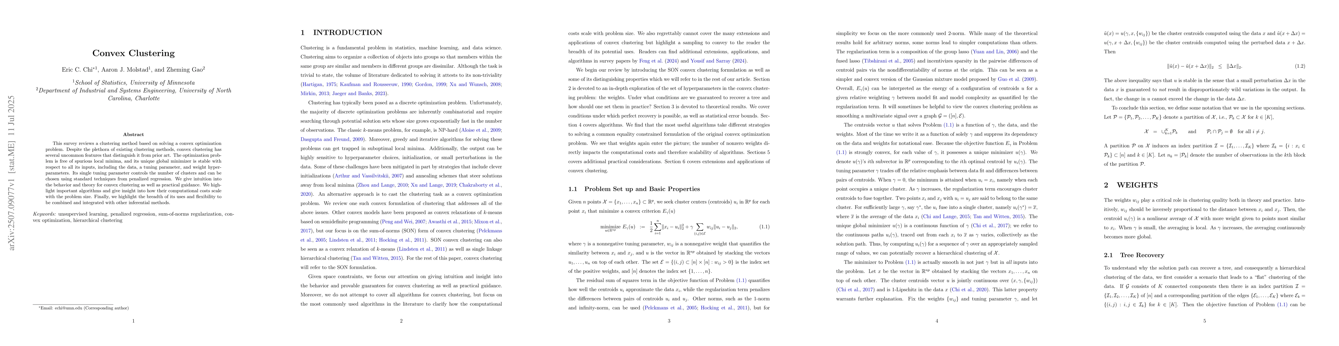 This survey reviews a clustering method based on solving a convex optimization problem. Despite the plethora of existing clustering methods, convex clustering has several uncommon features that distinguish it from prior art. The optimization problem is free of spurious local minima, and its unique global minimizer is stable with respect to all its inputs, including the data, a tuning parameter, and weight hyperparameters. Its single tuning parameter controls the number of clusters and can be chosen using standard techniques from penalized regression. We give intuition into the behavior and theory for convex clustering as well as practical guidance. We highlight important algorithms and give insight into how their computational costs scale with the problem size. Finally, we highlight the breadth of its uses and flexibility to be combined and integrated with other inferential methods.