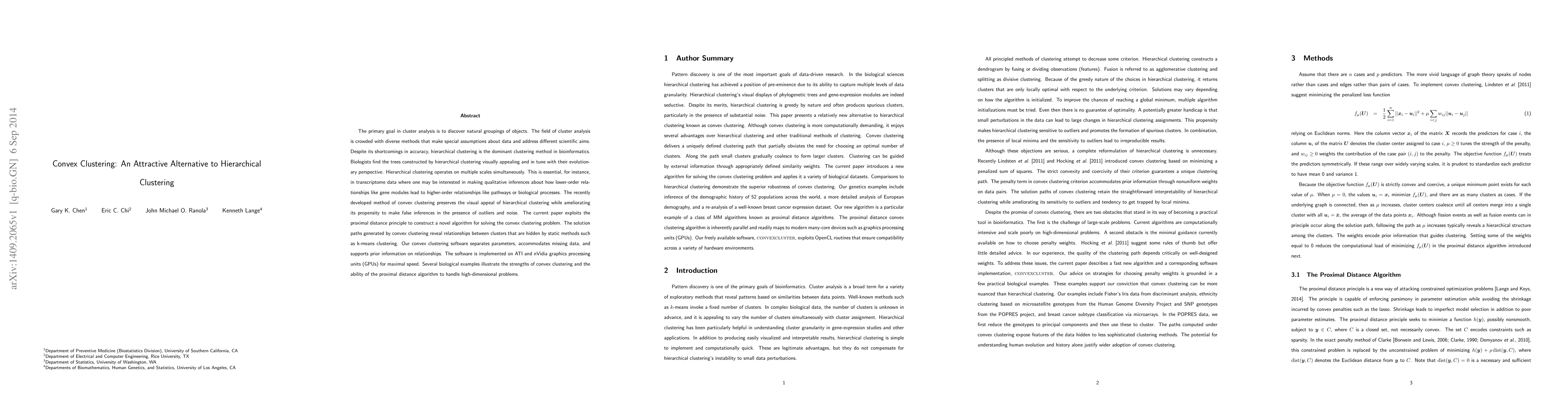 This paper introduces convex clustering as a robust alternative to hierarchical clustering, emphasizing its ability to handle outliers and noise while maintaining visual appeal. The proposed proximal distance algorithm efficiently solves the convex clustering problem, revealing hidden relationships in data, and is optimized for high-speed computation using GPUs.