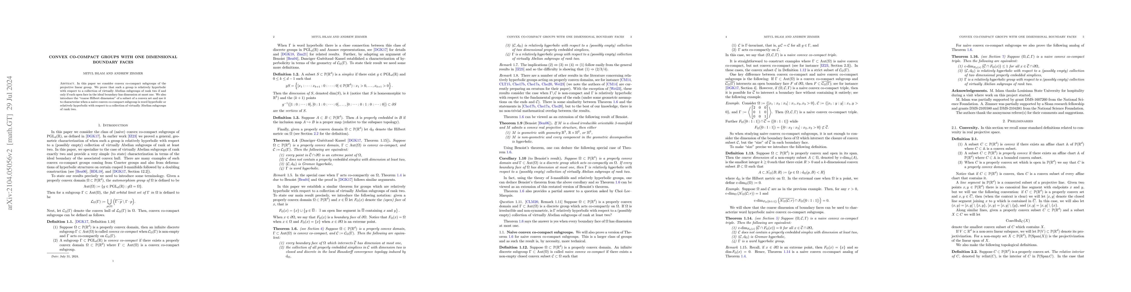 This paper investigates convex co-compact subgroups of the projective linear group, proving they are relatively hyperbolic with virtually Abelian subgroups of rank two if each face in the ideal boundary has dimension at most one. It also introduces the "coarse Hilbert dimension" to characterize when such subgroups exhibit word hyperbolic or relative hyperbolic properties.